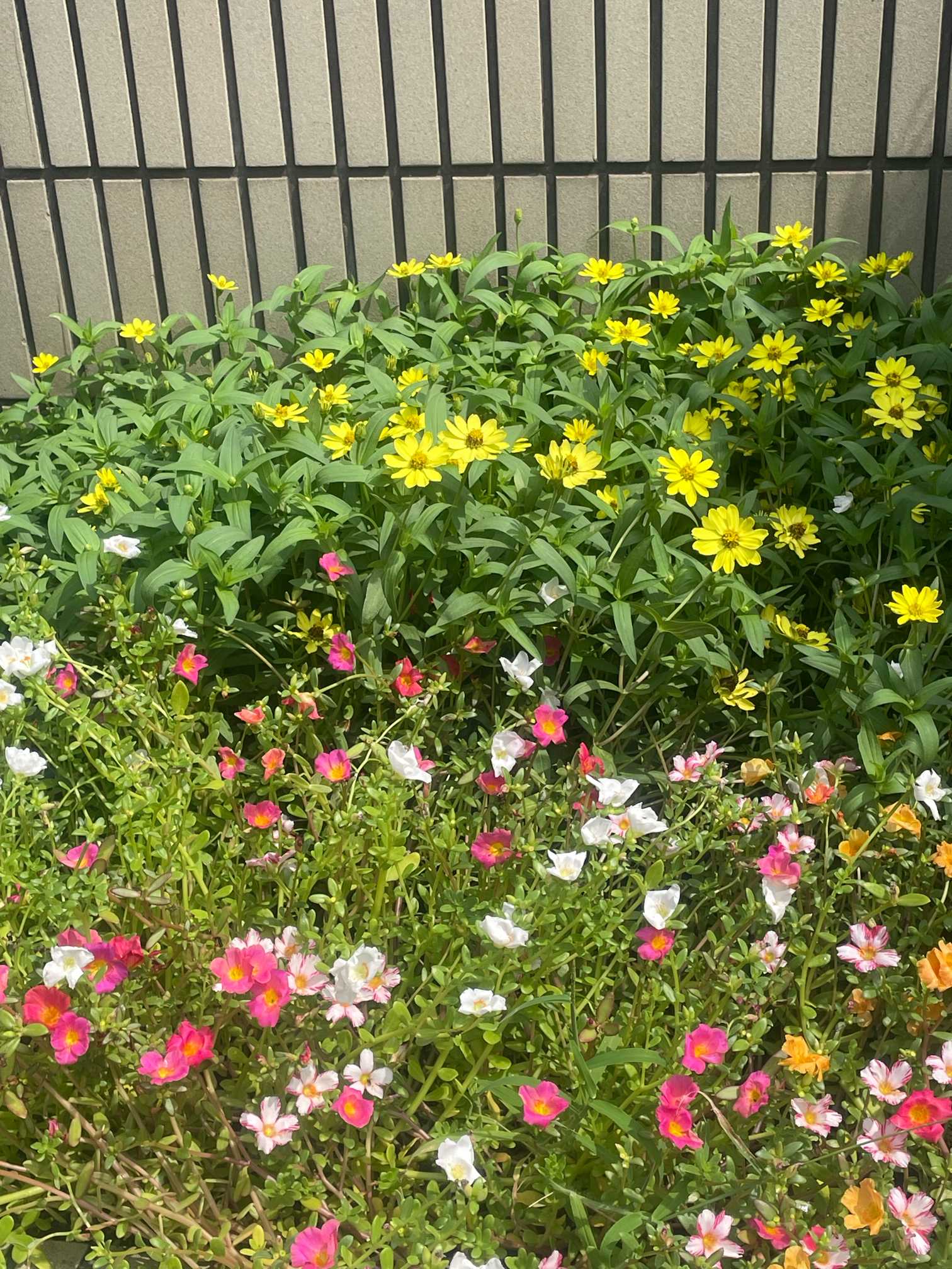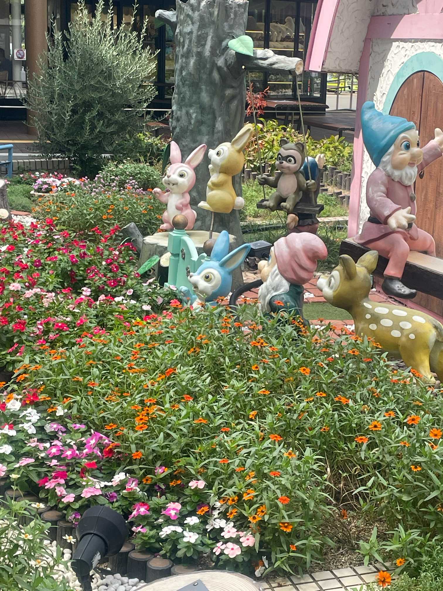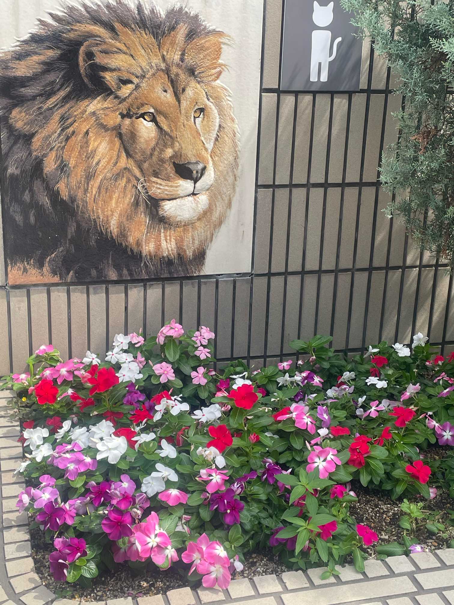 お手洗いの前の花壇。ライオンが見守るニチニチソウがきれいでした🌸🦁