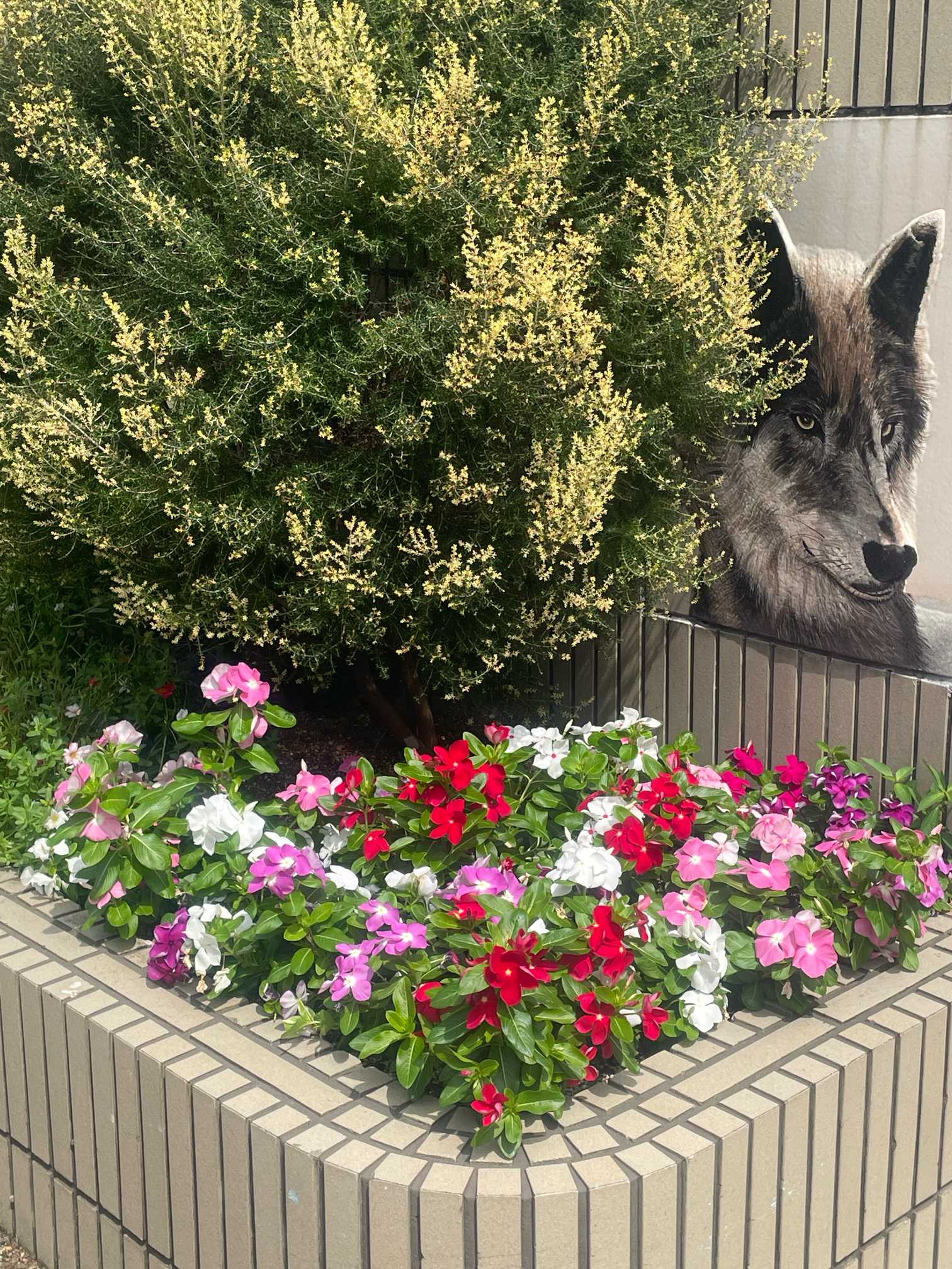 こちら側にはシンリンオオカミが見守るニチニチソウ🌸🐺✨