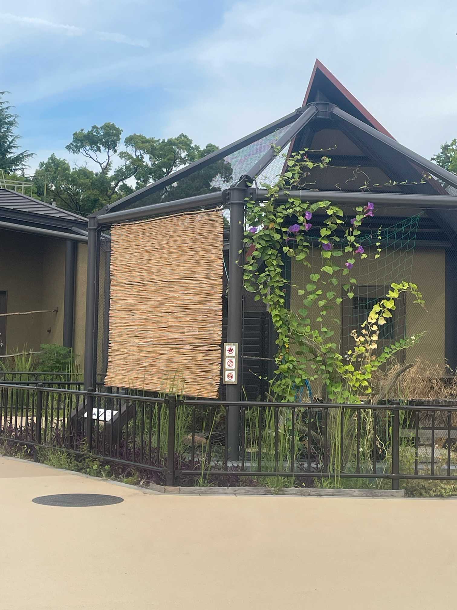 鳥のセカイにある大きな鳥かごの一つ。暑さ対策でグリーンカーテンにはアサガオが🎐