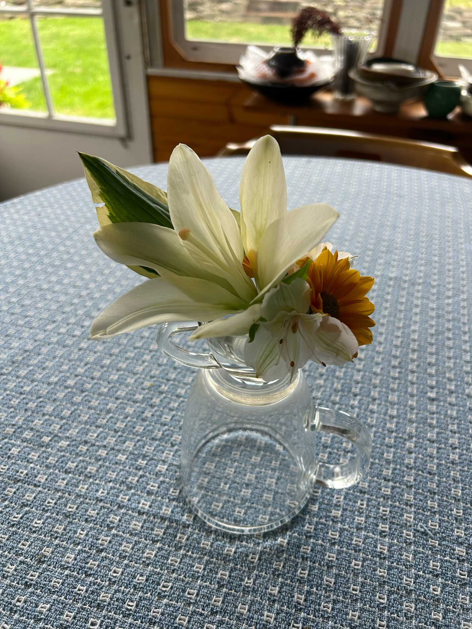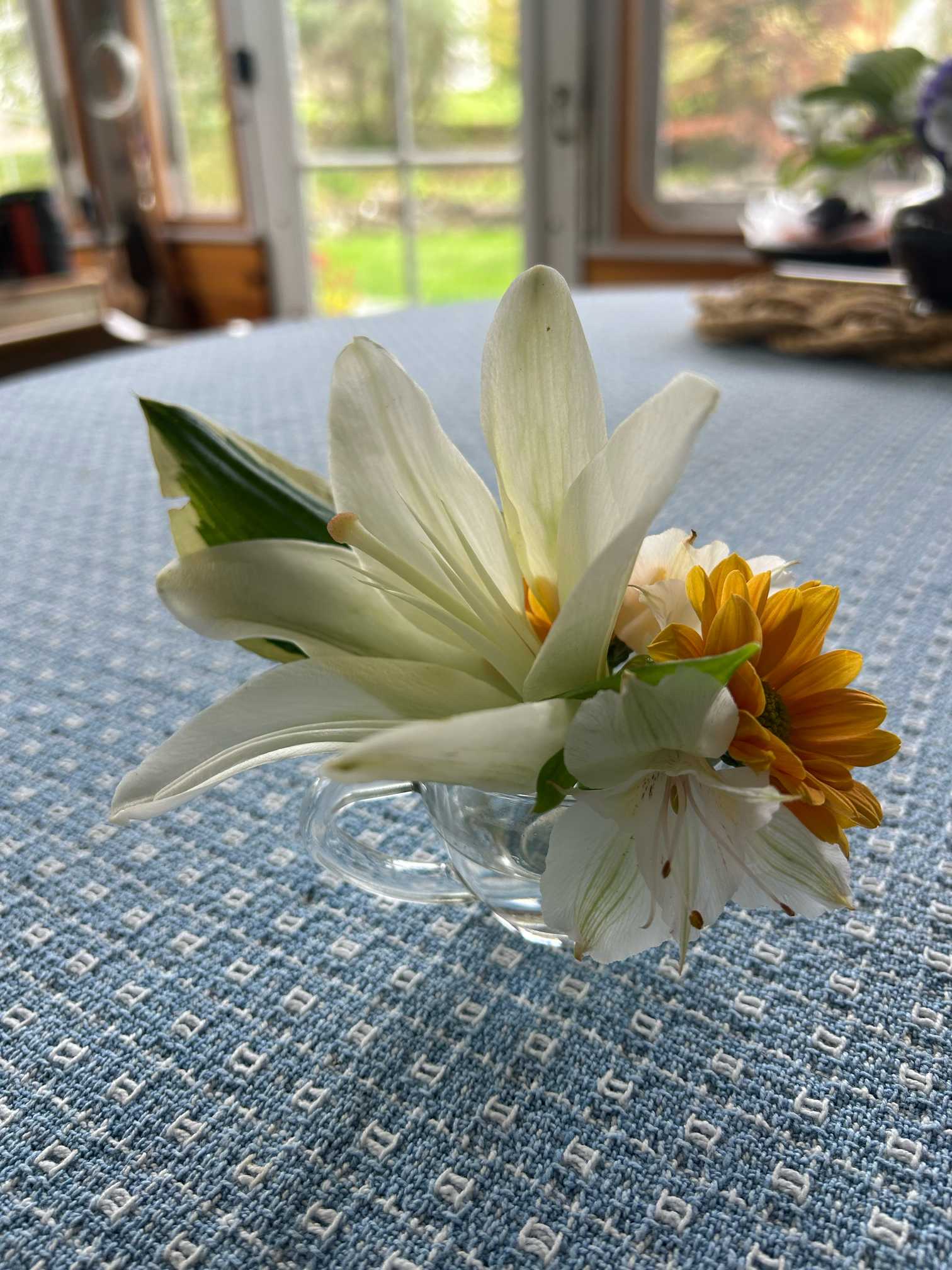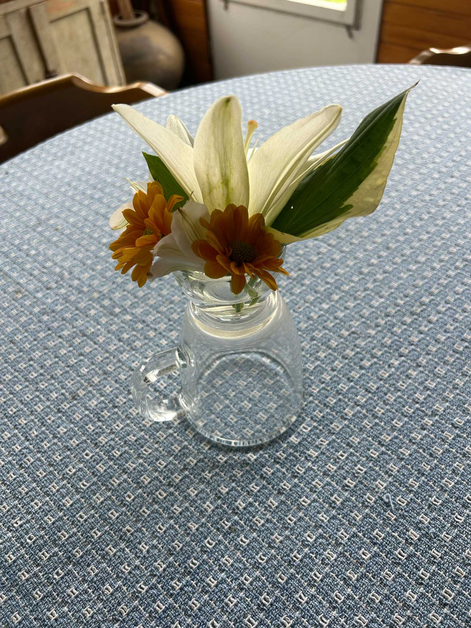 生け花のクラスで花を移動する時、新鮮なのに折れたりすることがあります。少ない花でリサイクルアレンジ作ります