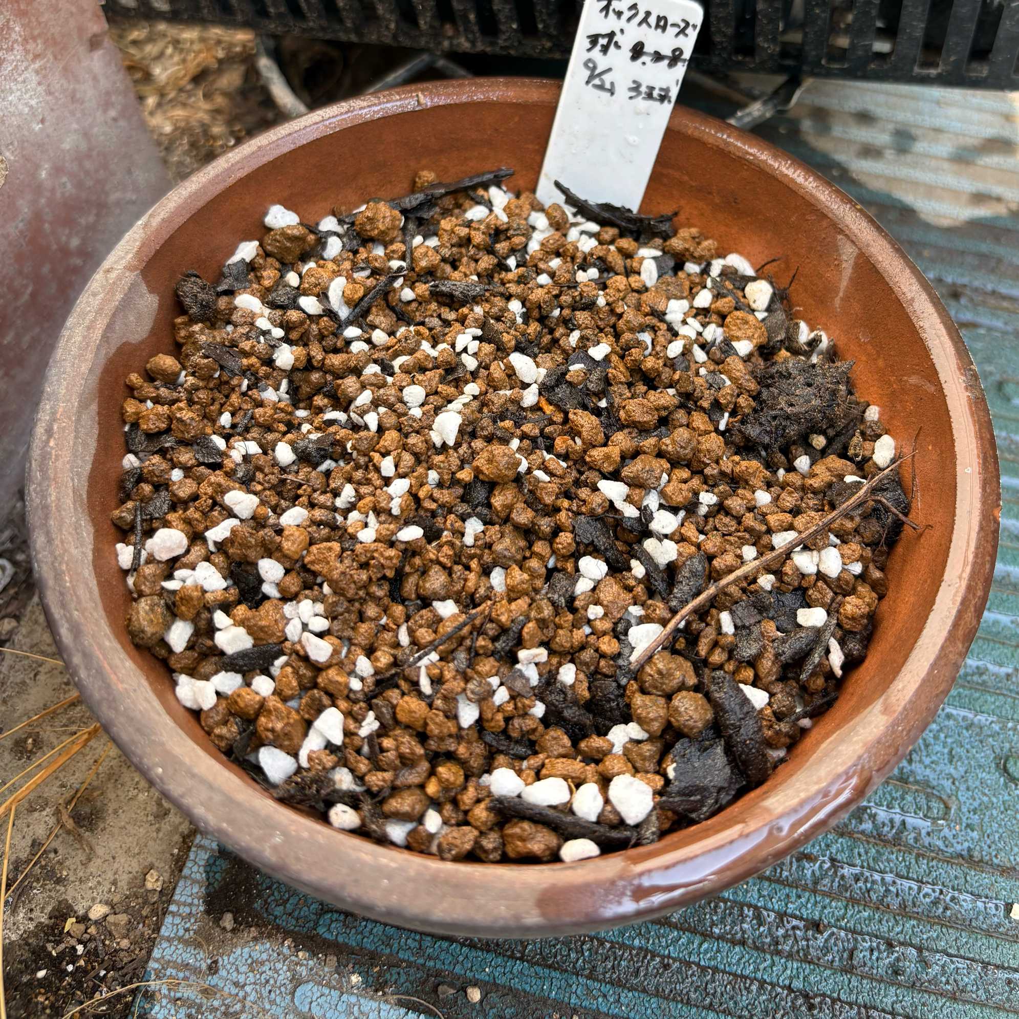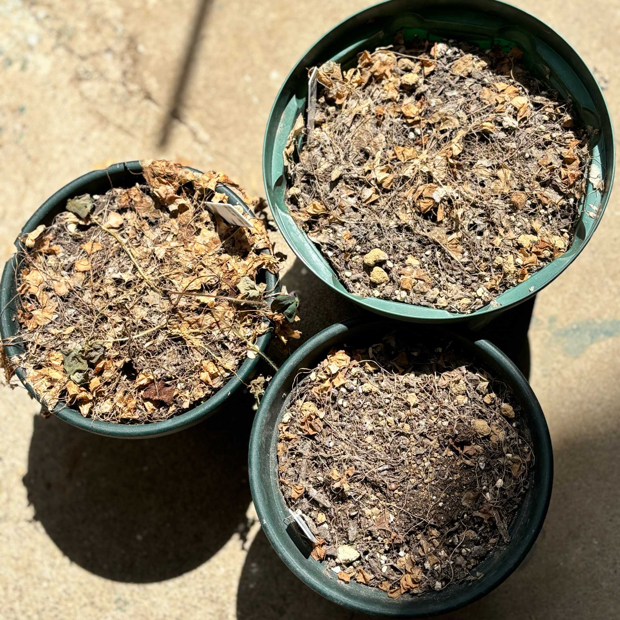 初夏に葉っぱが萎れた鉢を、雨の当たらない倉庫の上で乾燥させたまま放置していました