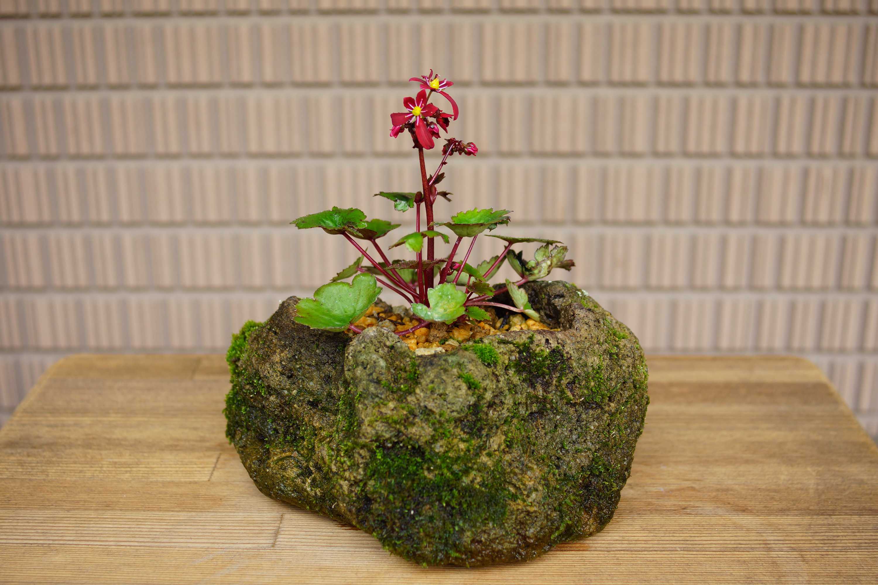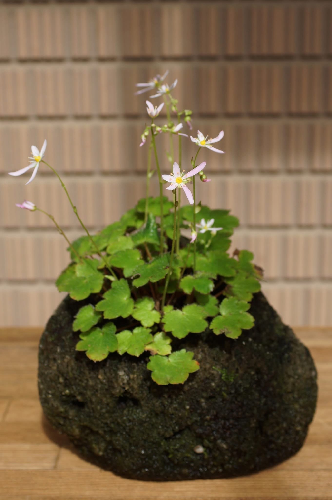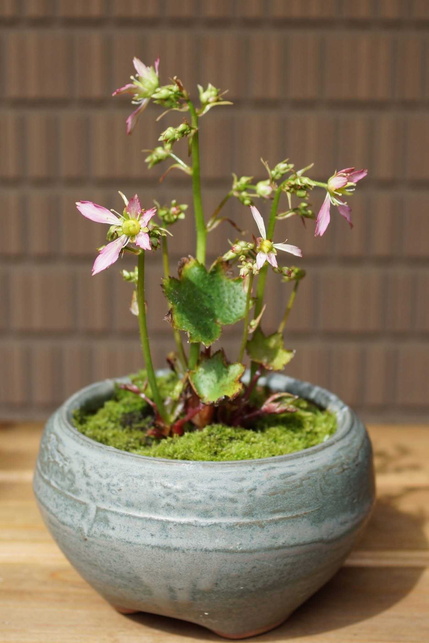苔の育った軽石の鉢に植えてみました。ところが、家主が裏と思っていた方を向いて咲きました😅