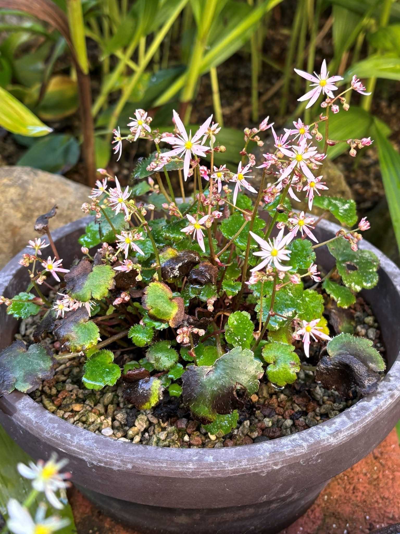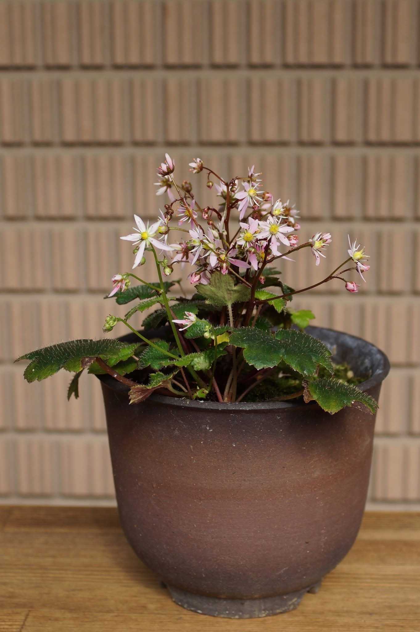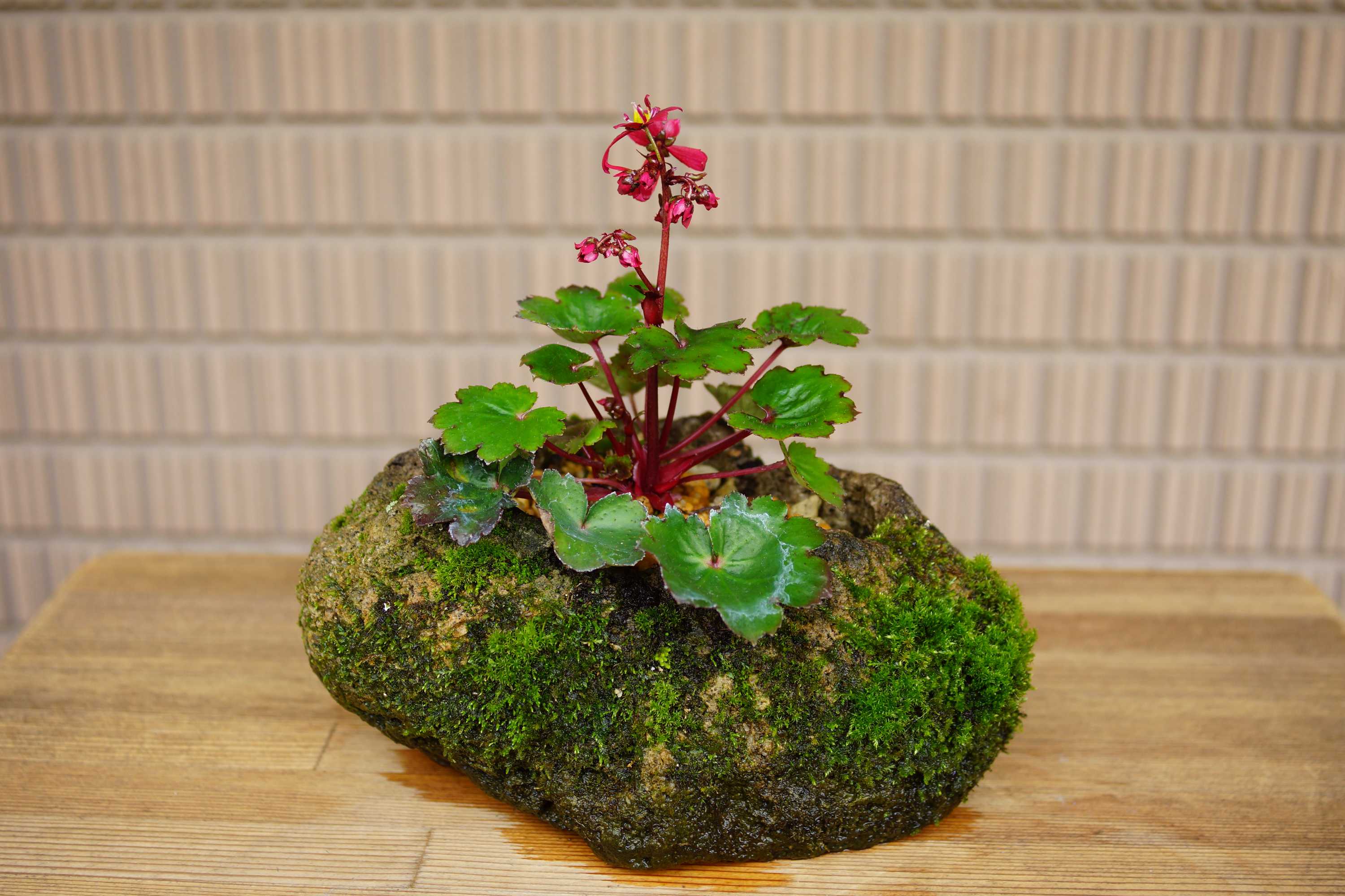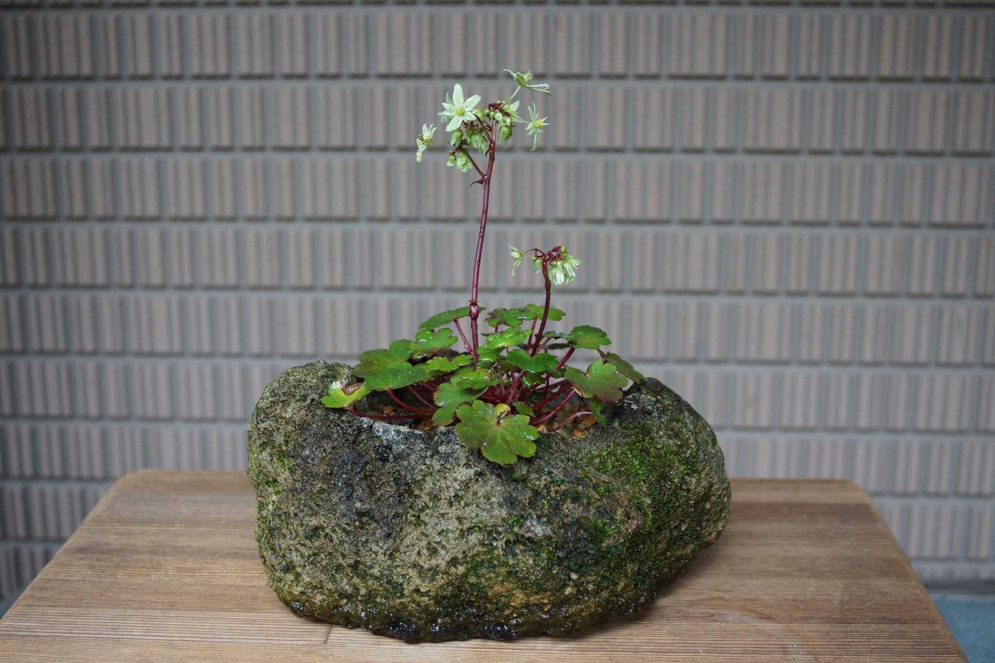 苔の育った軽石の鉢に植えてみました。ところが、家主が裏と思っていた方を向いて咲きました😅