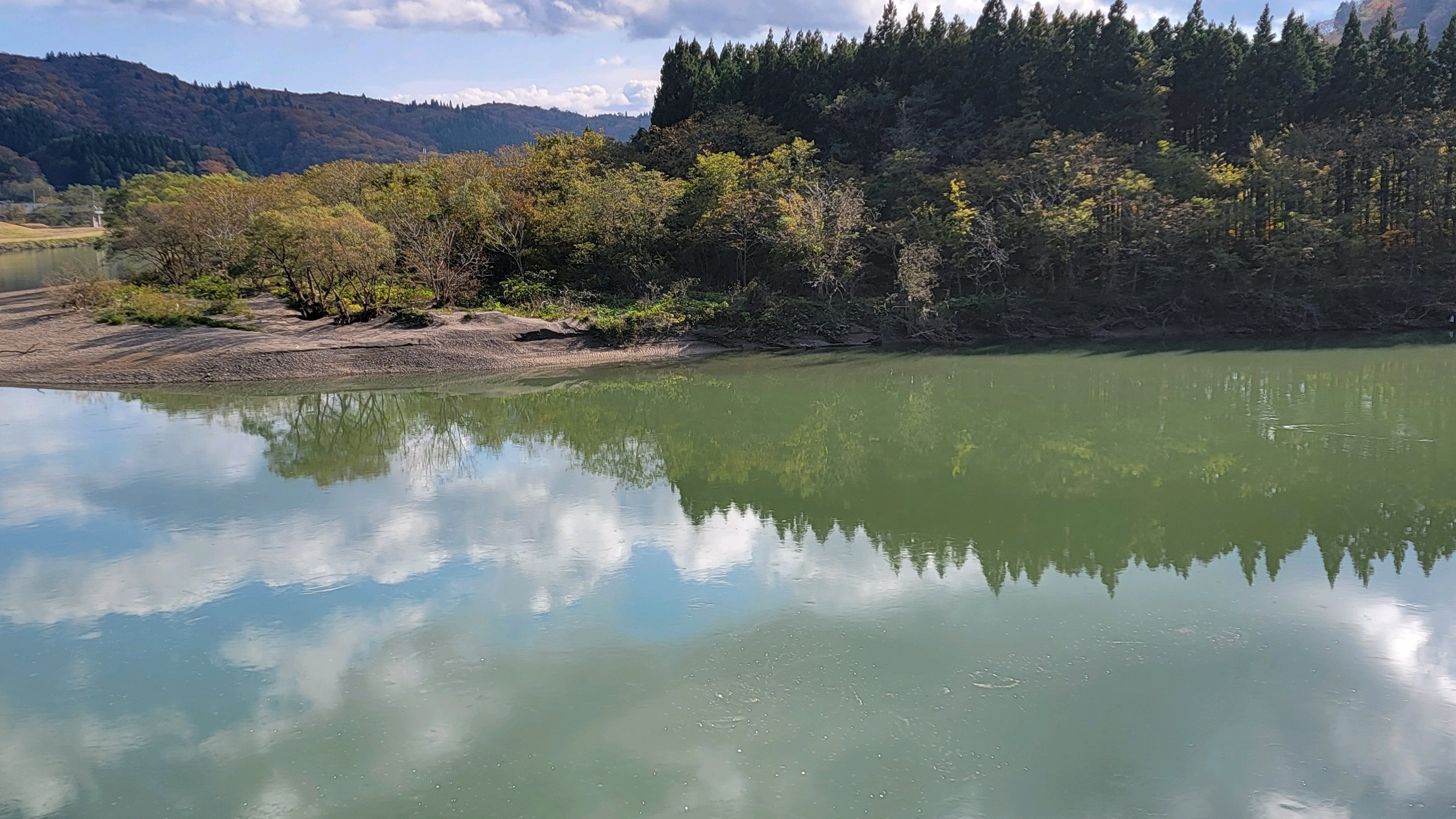 米代川に写る青空と雲と山肌