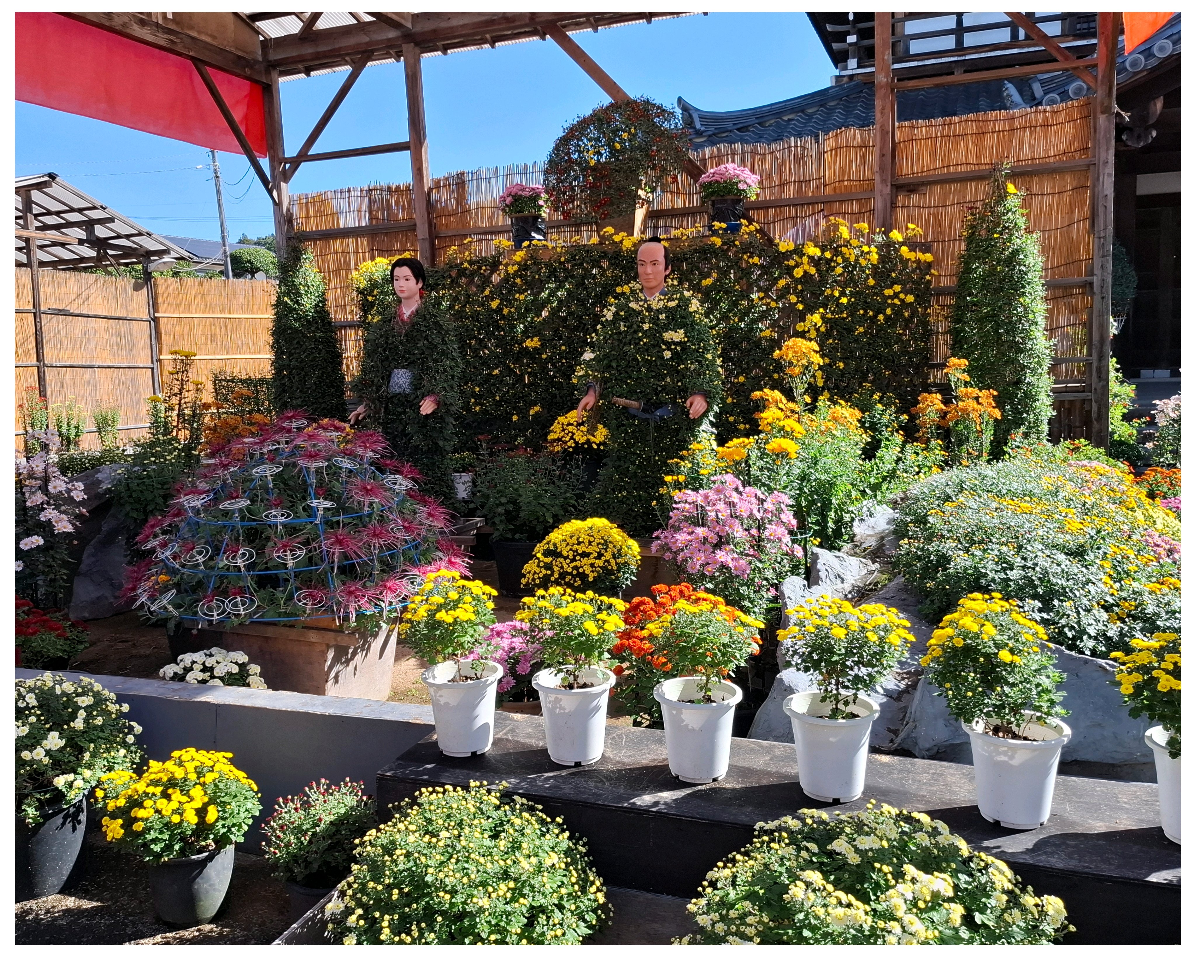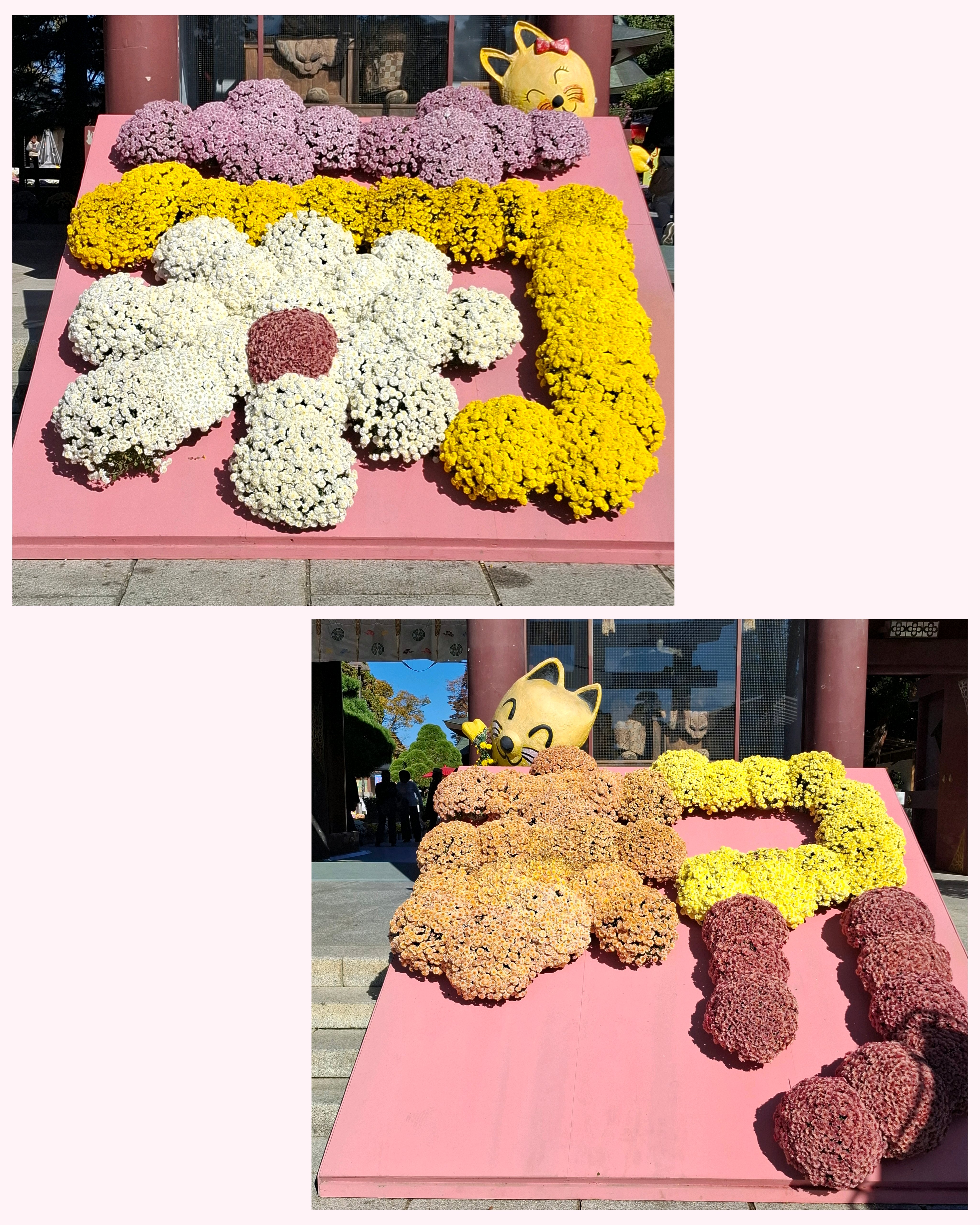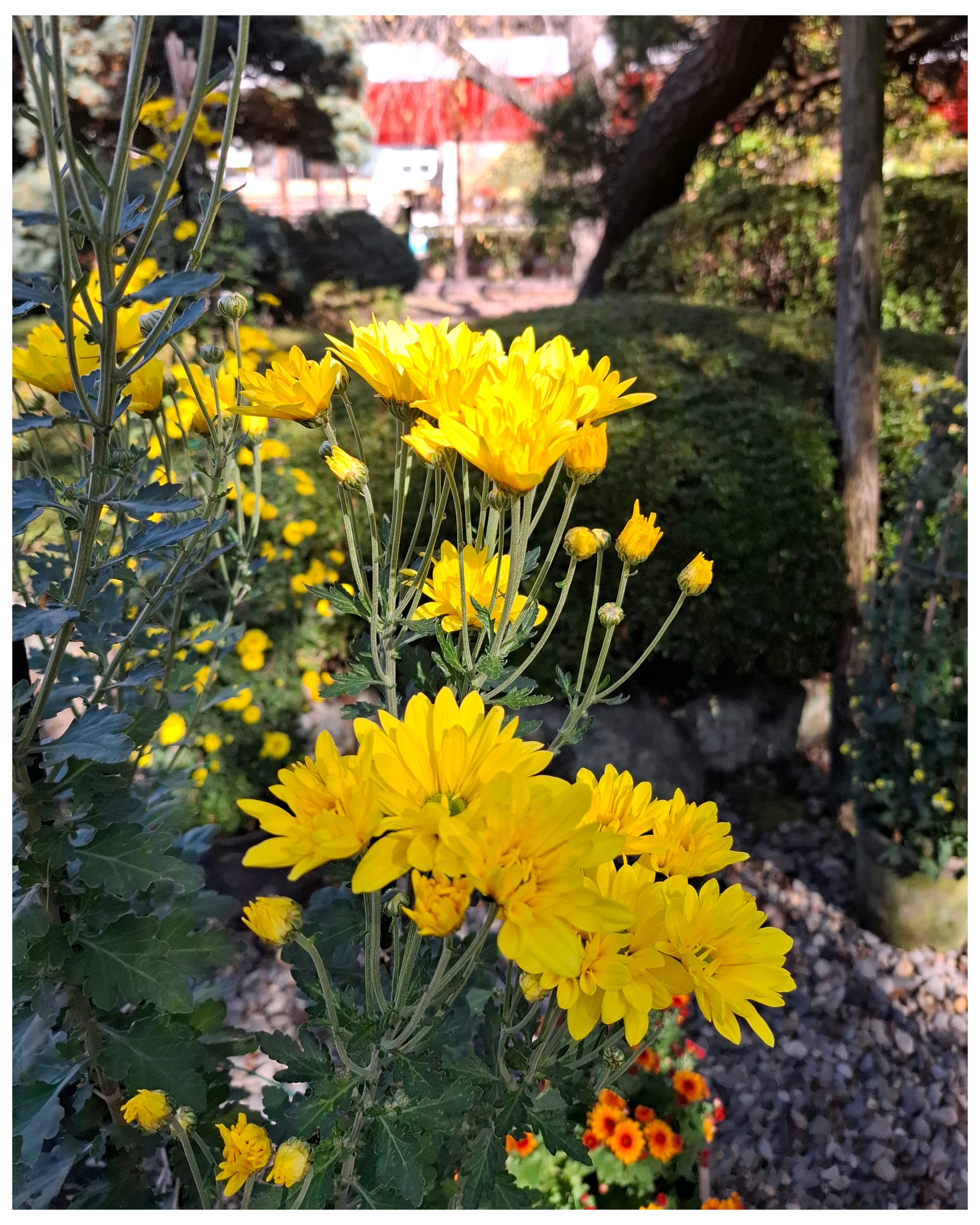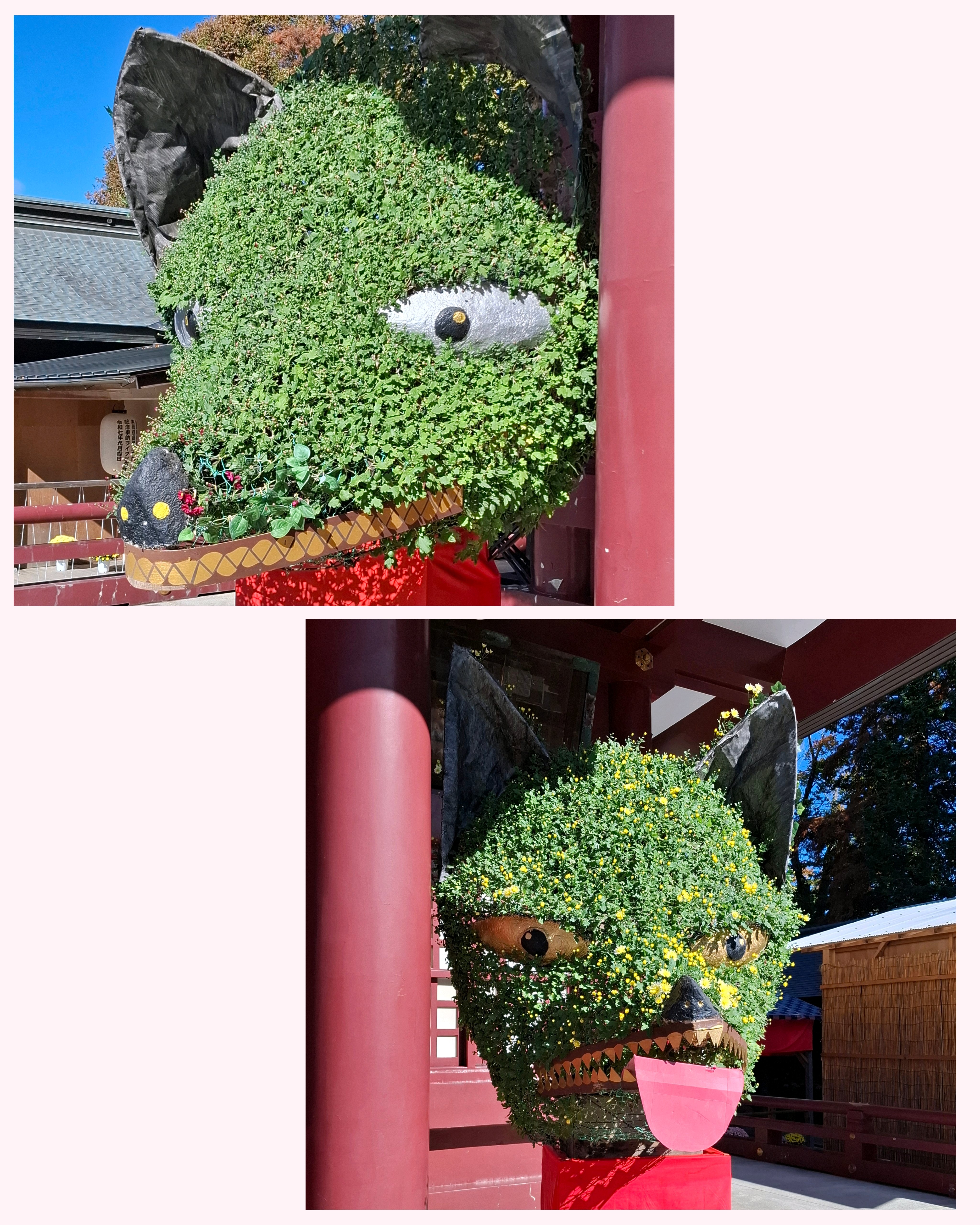 キツネ🦊の顔がまだ緑の葉っぱ🌿が多い。黄色い💛菊の花が咲いて、黄色い🦊になったところも見てみたい😆。