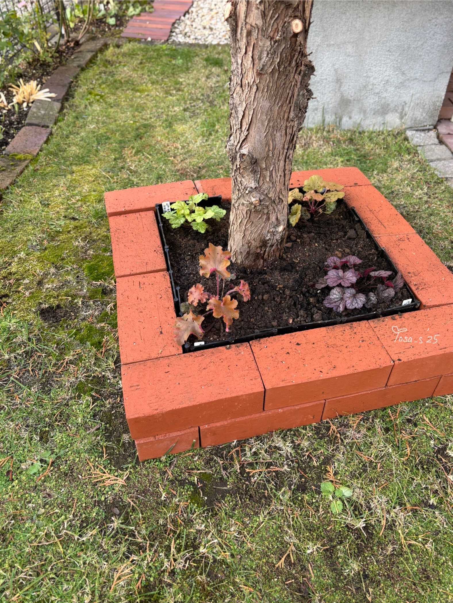 芝生が思うように育たない木の下に花壇を作ることにしました🍀ヒューケラドルチェも植えられて明るくなり一石二鳥✨スクスク育ちますように☺️