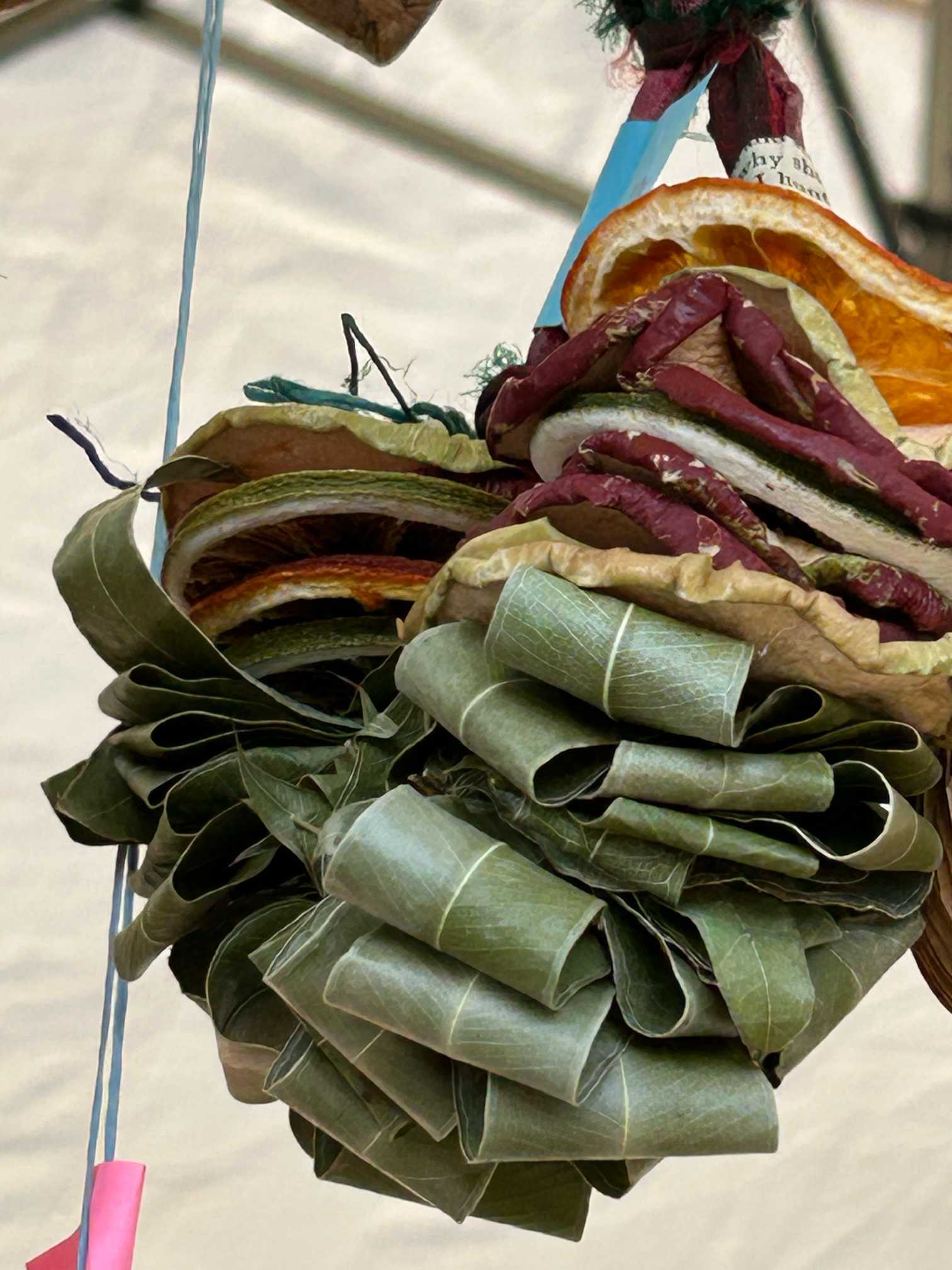 葉とオレンジなどを束ねたリース?
