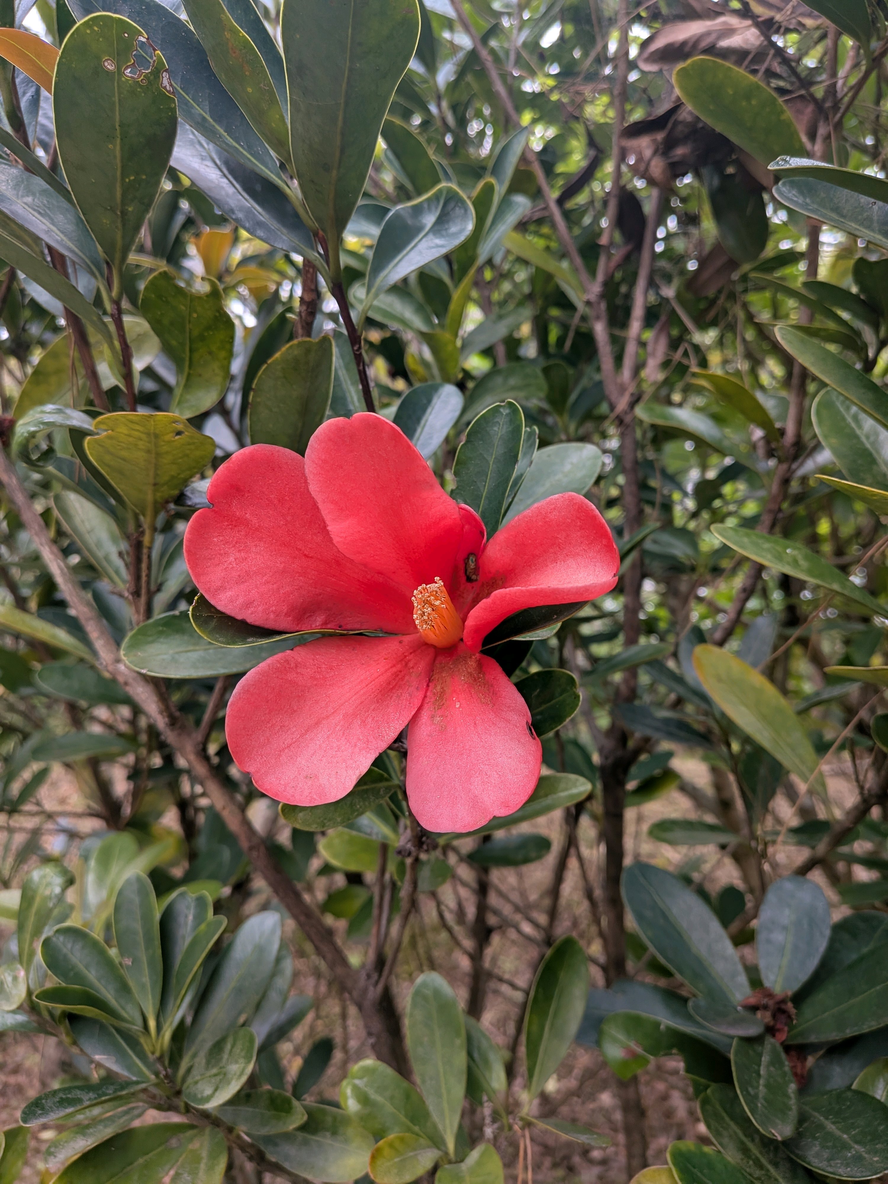 このお花はなんだろう❓️タイサンボクみたいなお花。アザレアツバキかな?