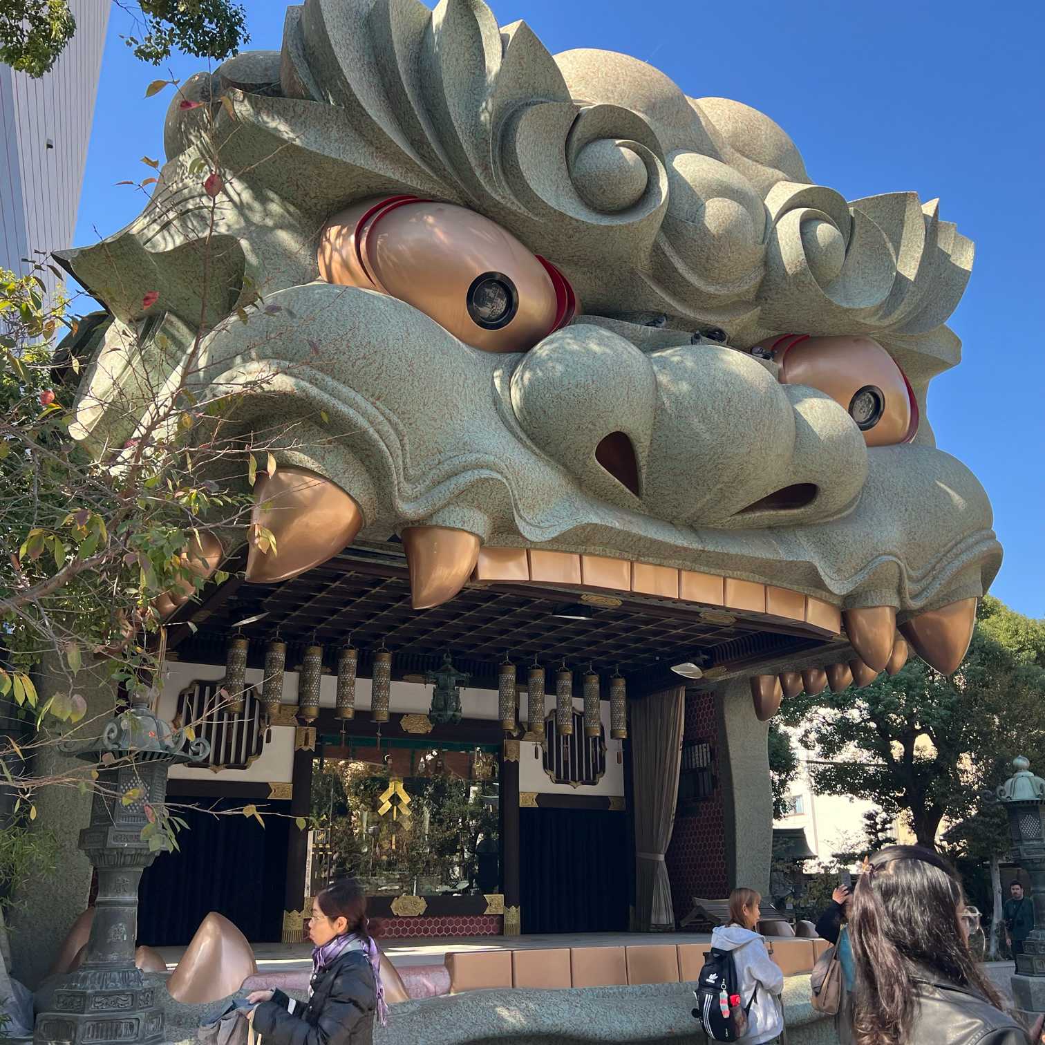 巨大な獅子頭を背に記念写真