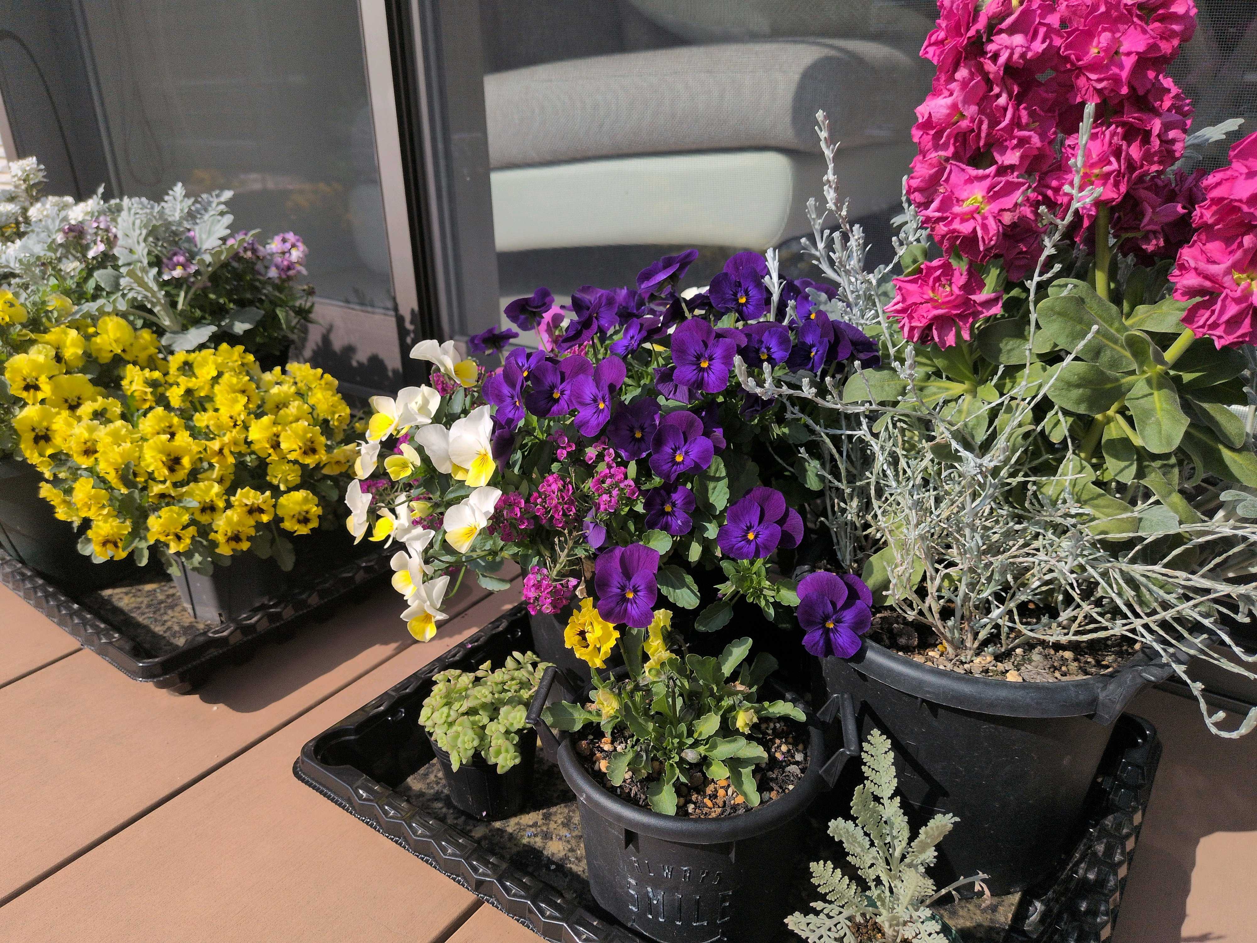購入した苗も増えたので、寄せ植えなども開始。