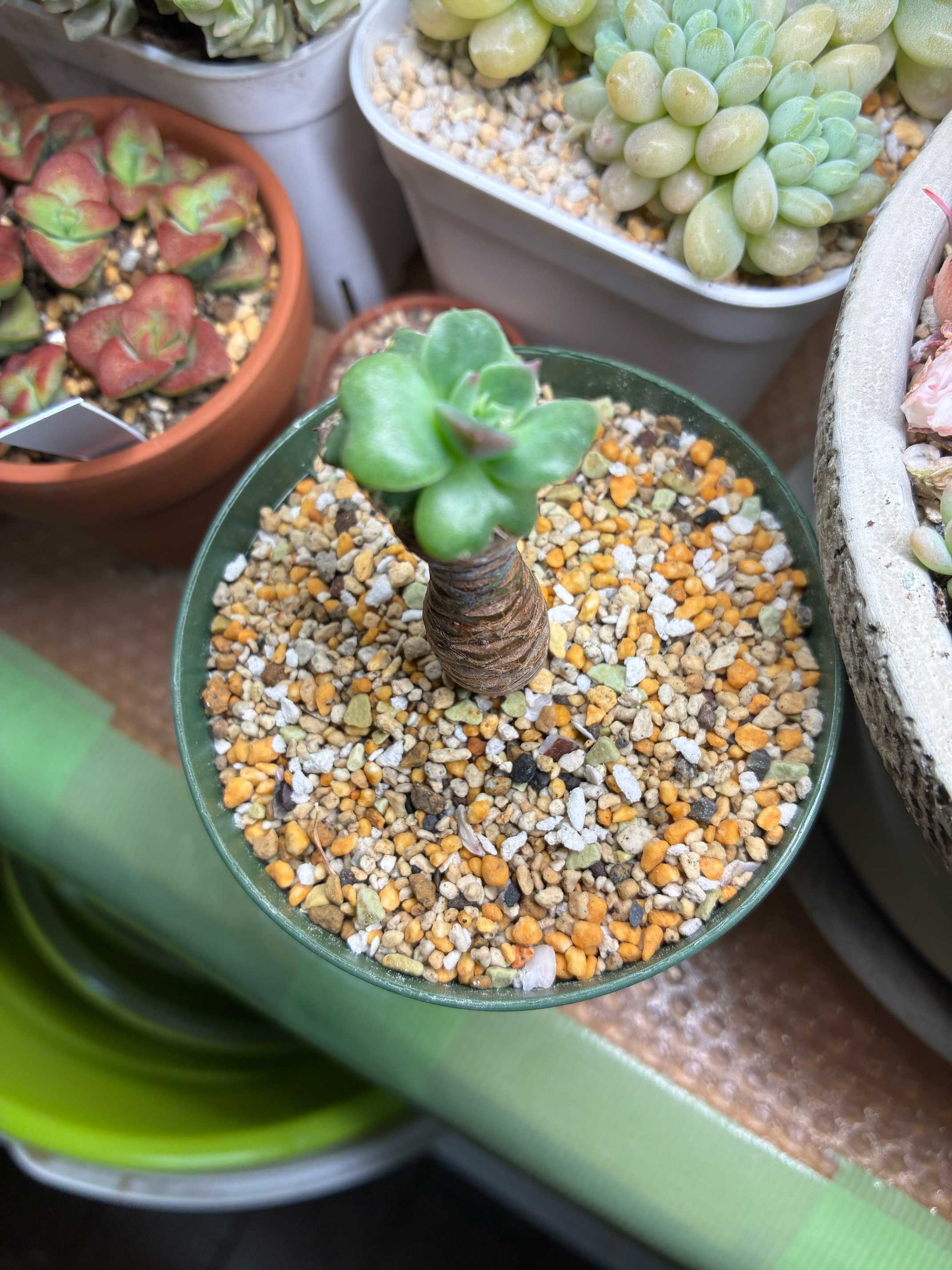 とりあえず向こうのライトで育成してた苗を移動、根が動くまで室内養生してるセダムもこっちに設置。向こうのライトに比べると白みが弱い気がする カンテは強光が好きなので、あっちに置いたままにする