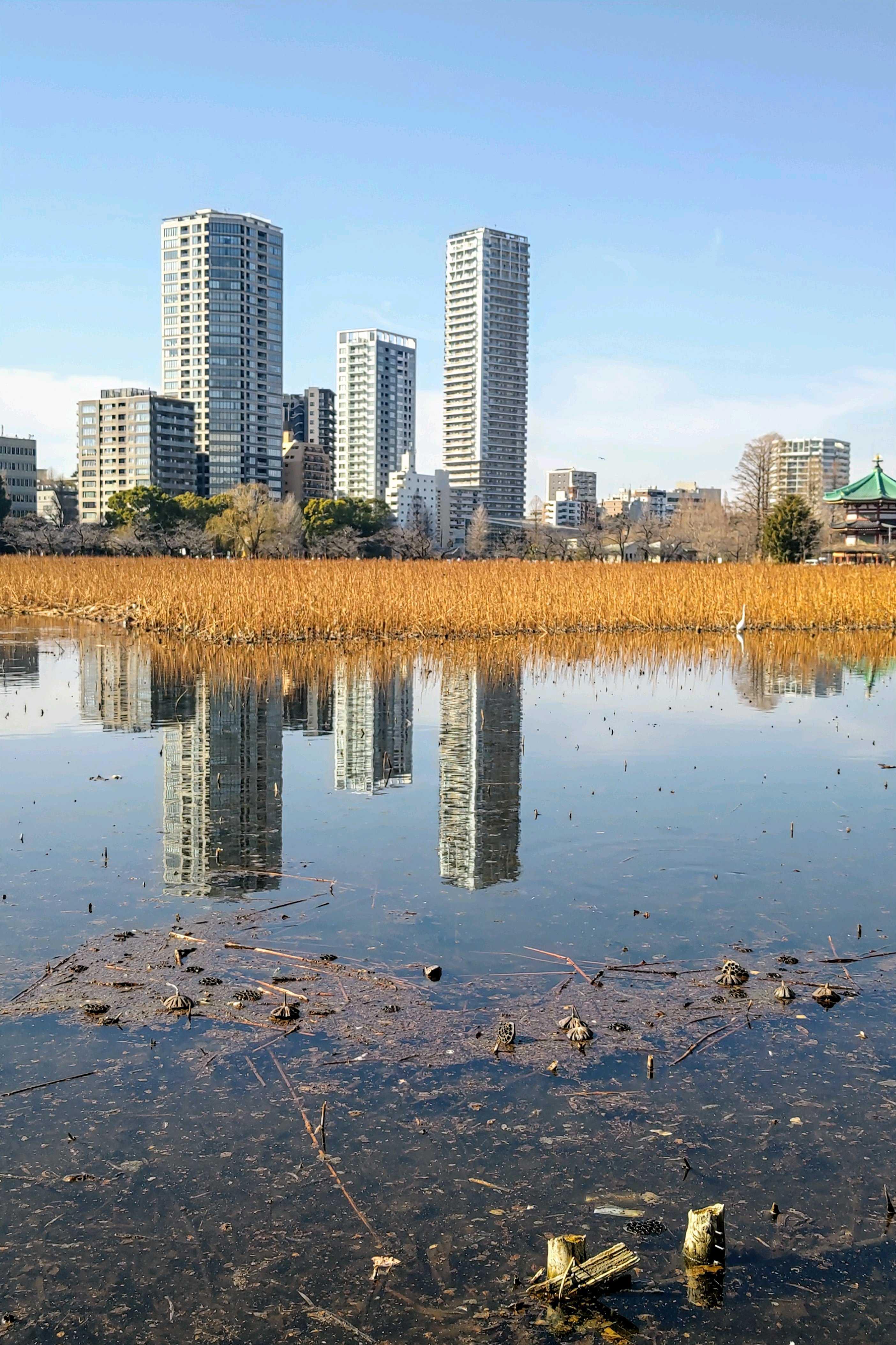 上野不忍池の枯れ蓮の除去が進み水面が現れて。手作業で2ヶ月程かかると聞く、除去の作業は見にこれなかったけど初めて見る水鏡。