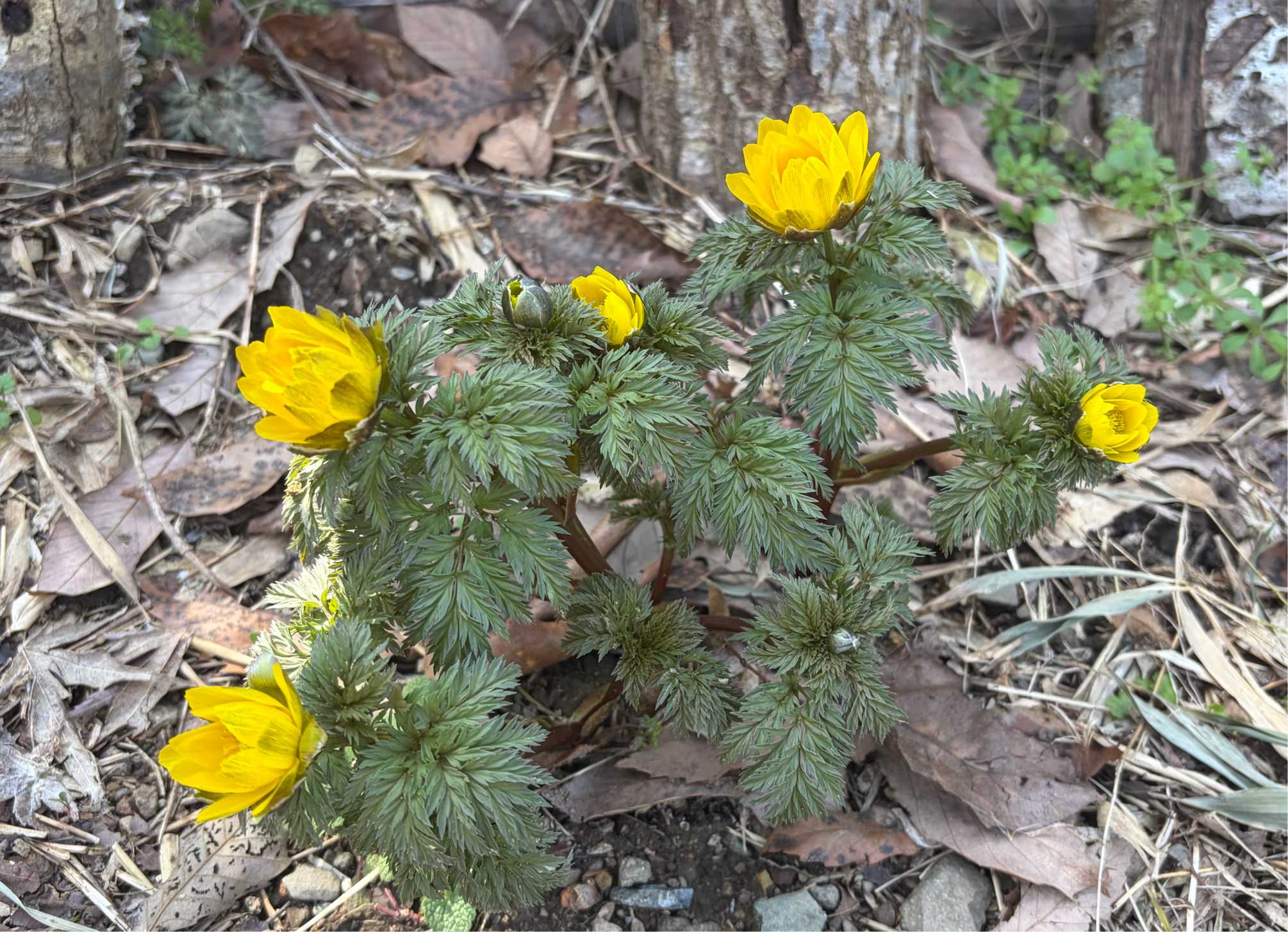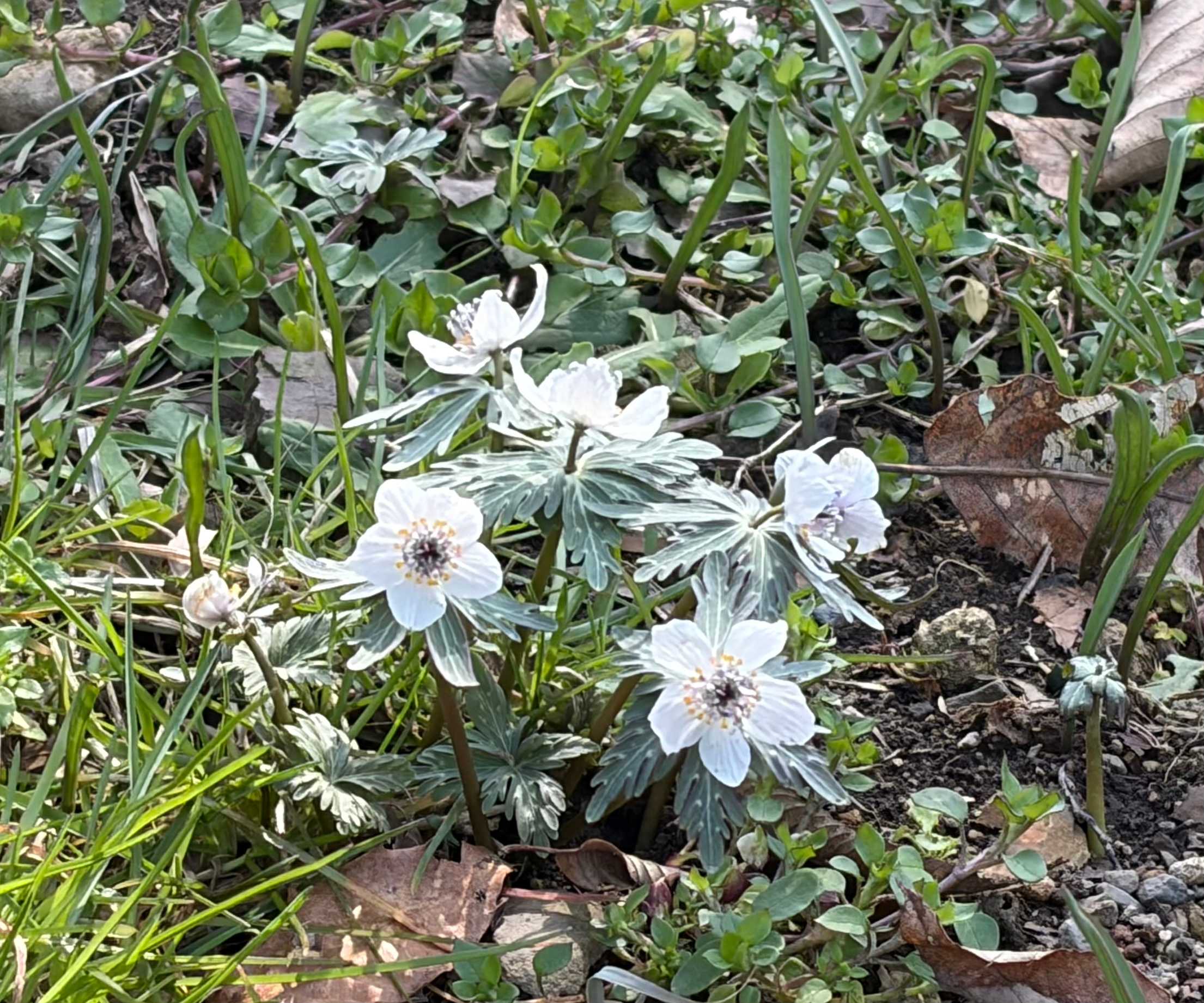 節分草に混じって菊咲一華が咲いてました。