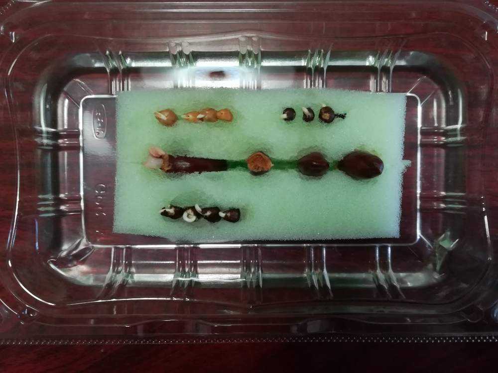 プラスチックのトレーに水をはって、スポンジの上に芽切りをしたアサガオの種を乗せます。