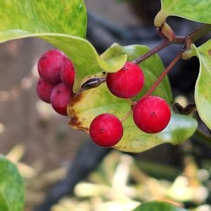 ①~③真っ赤に色づいた、山帰来の実。 ④⑤ニシキギの実も、赤く色づきました。