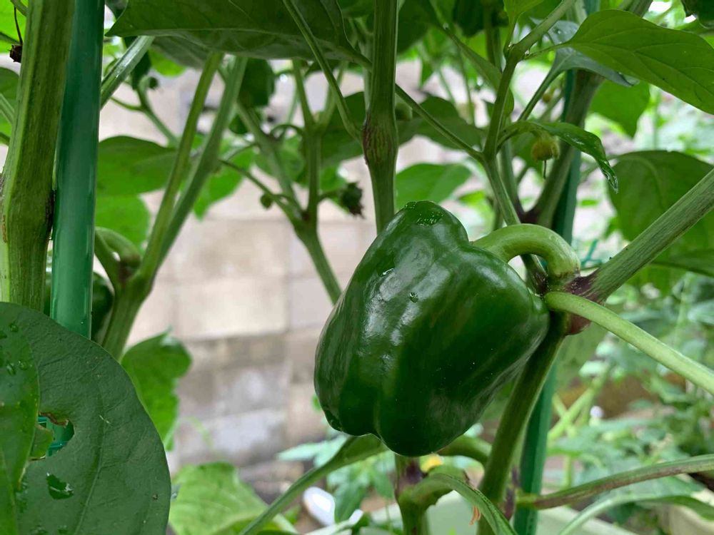 降る雨に濡れてるプランター菜園のピーマン。