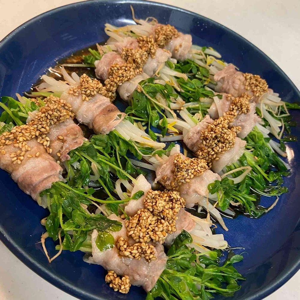 「レンジで!もやしと豆苗の豚巻きレンジ蒸し」