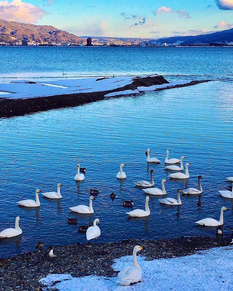 さて、これを写したのは、今週の日曜日の夕方で、ひょっとしたら、もう北に帰ってしまっているだろうか?と心配しつつ出掛けてみたら、まだいたので一安心🦢 寒波の到来が旅立ちの日程を遅らせているのだと思います。 夕暮れ時で、こちら側は、もう日が隠れています😊そのせいか、湖面が青く見えました! もう少し待てば、夕陽に染まる諏訪湖が見られたかもしれませんが、バッテリー切れで、撤収いたしました!😭…寒かったし😵💦💦