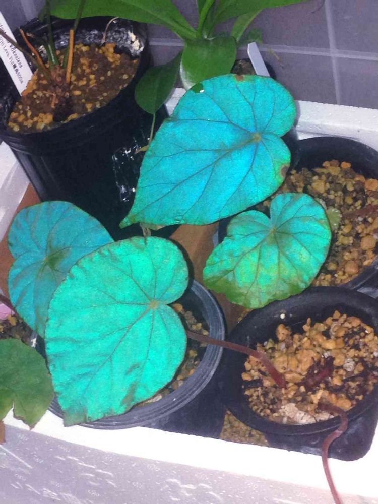 以前も紹介した光を青く反射する原種ベゴニアのパボニナです。これはスマホのライトで撮影しました。
