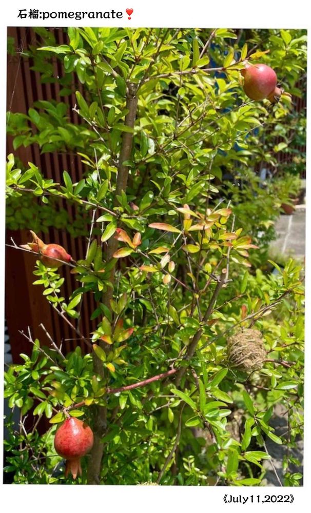 📝この写真画像は、酒饅頭屋さんの小さな箱庭の花壇に植栽されているザクロの木で、実が成っている様子を撮影したものデス🐶