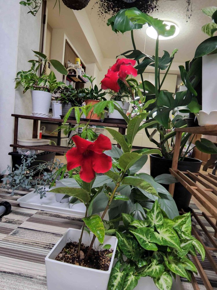 普段L字に木の靴箱(笑)を置いて、そこに植物🌱を置いているのですが、周りの床にベランダ族を移動しました❗