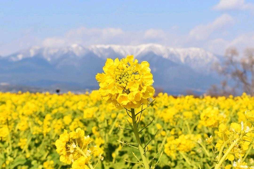 冠雪の比良山と畑一面の早咲き菜の花(寒咲花菜)✨