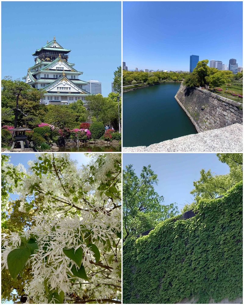 青い空、天守閣だけの大阪城、蔦の緑、躑躅、なんじゃもんじゃの木。