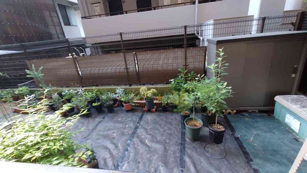鉄のフェンスには、元々薄い木のラティス付いてましたが劣化してたので全部剥がして、シェードで下半分を隠しました😅
