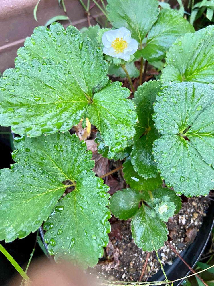 出勤前に庭を見たら、イチゴ🍓の株に花が咲いていました。