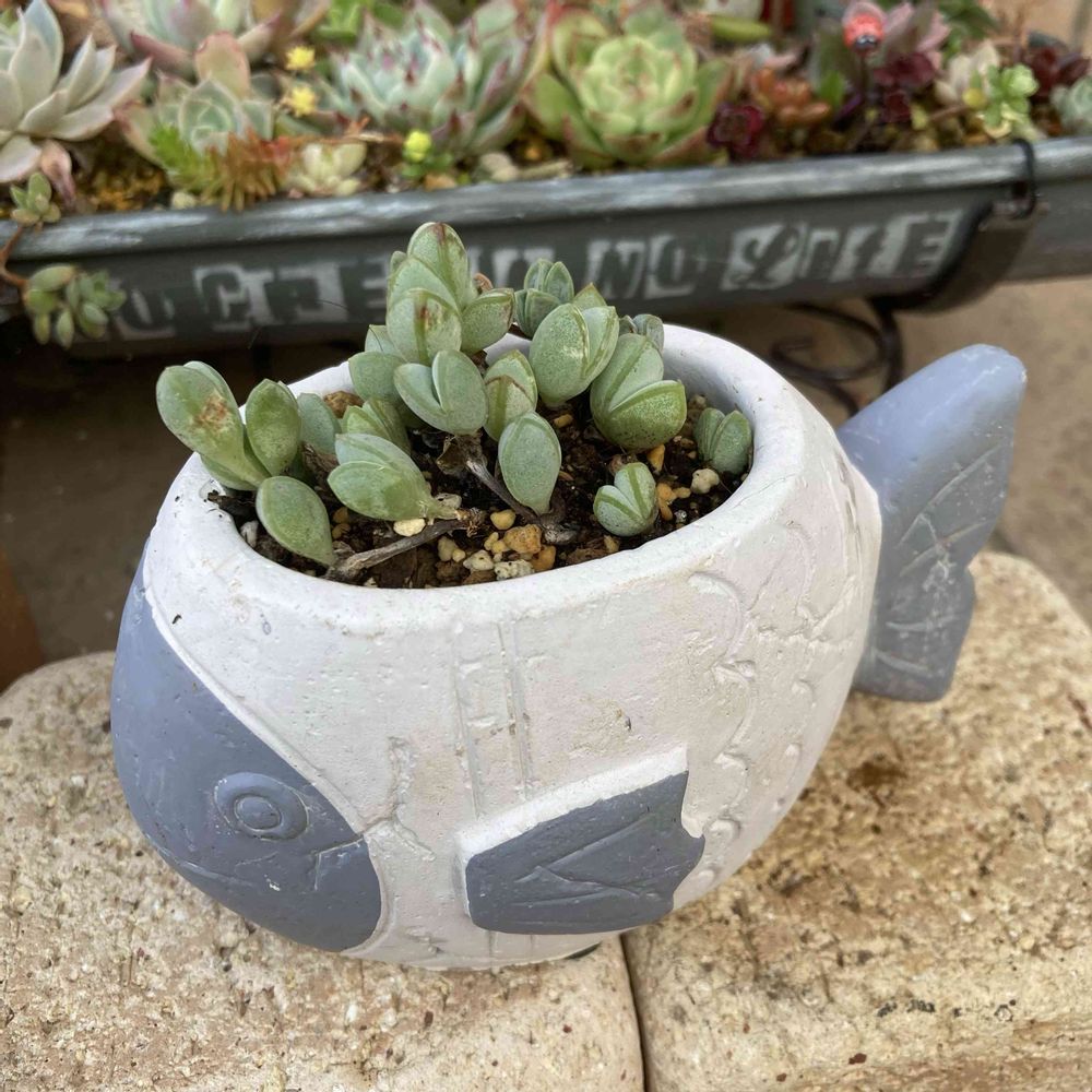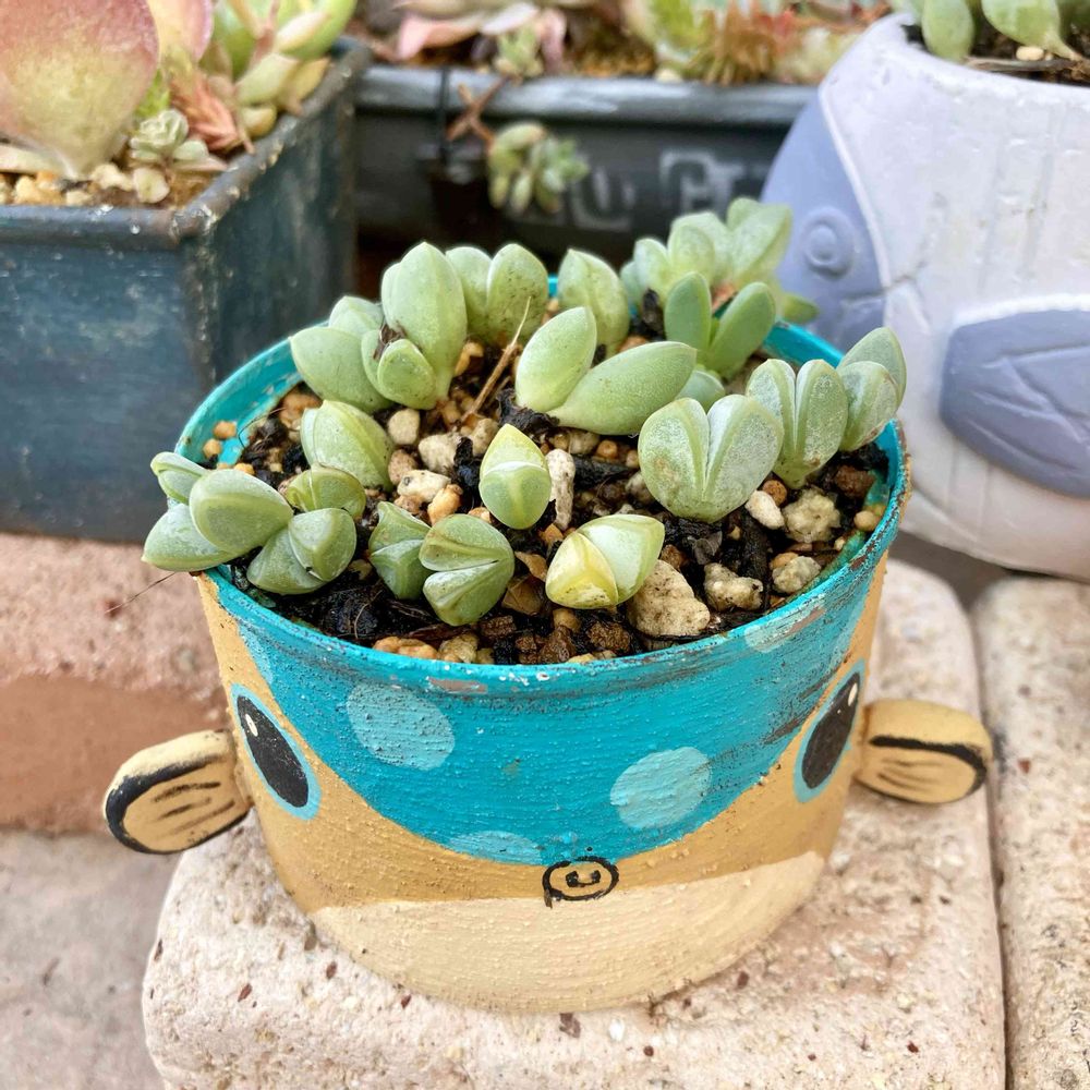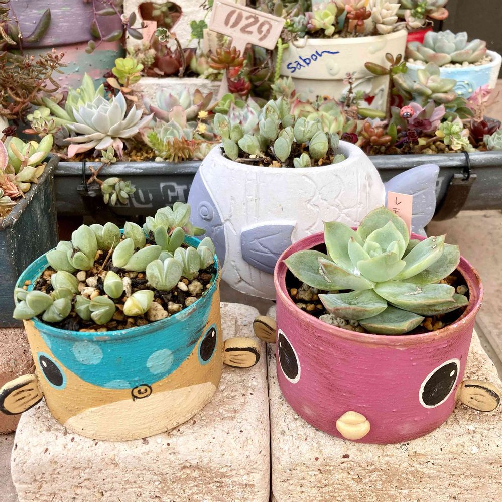 ハコフグちゃんと後ろのお魚鉢にカクトロコさんの碧魚連を植えました😊