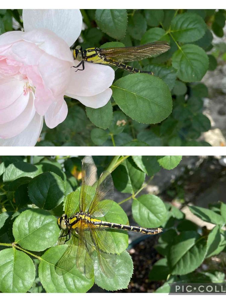 ばらの枝にギンヤンマが羽を休めていました。今朝は少し冷えたので