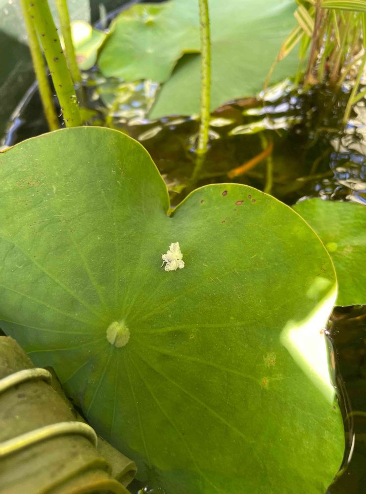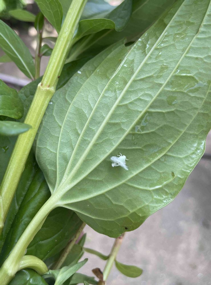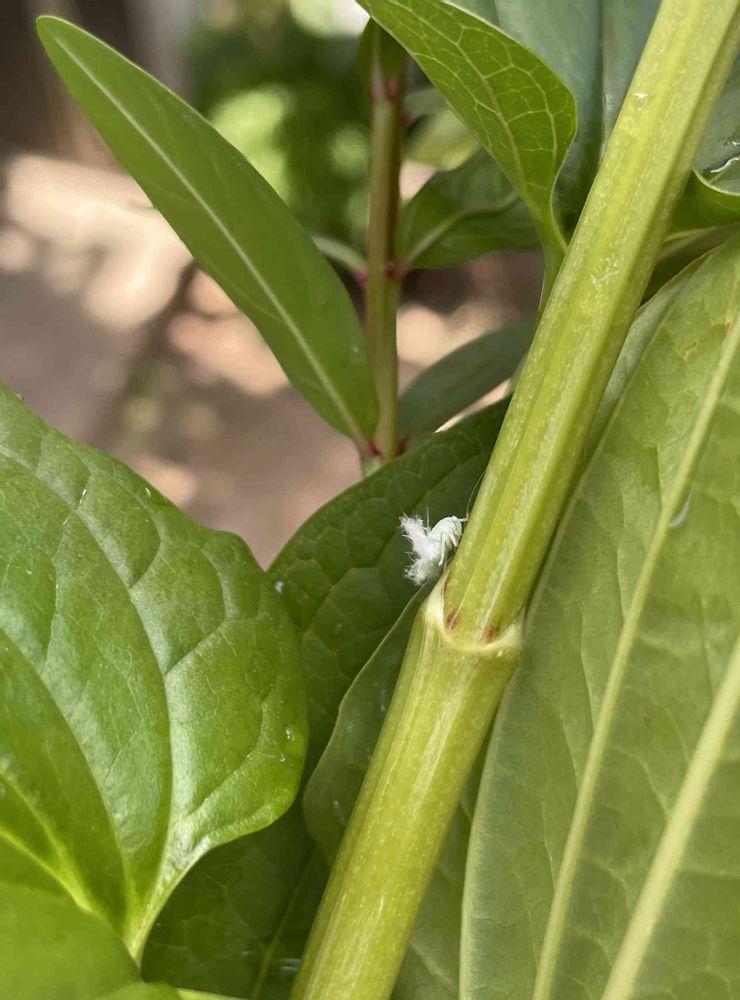 数日前からウチの植物に変な虫が付いています。ガガブタのモケモケみたいな白花?と思ったら、動き出してビックリしました‼️どこから来たのか?