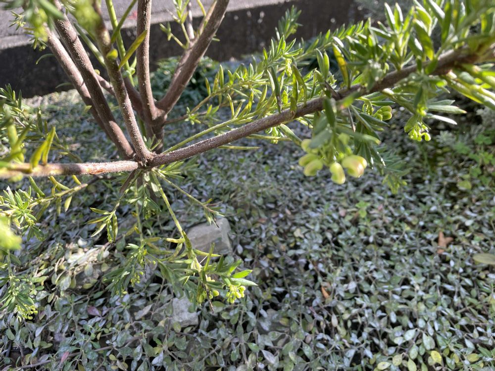 グレビレア ジュビリーは春と秋にも開花するようです😳只今花芽が沢山ついてますが朝晩寒いのに大丈夫なのだろうか🙄🙄イエロードロップと似た形状の花ですが、色は緑🟢で先っちょが少しピンクですが小さいはなであまり目立ちません、幹肌が赤く、黄緑の葉との対比が綺麗です😍
