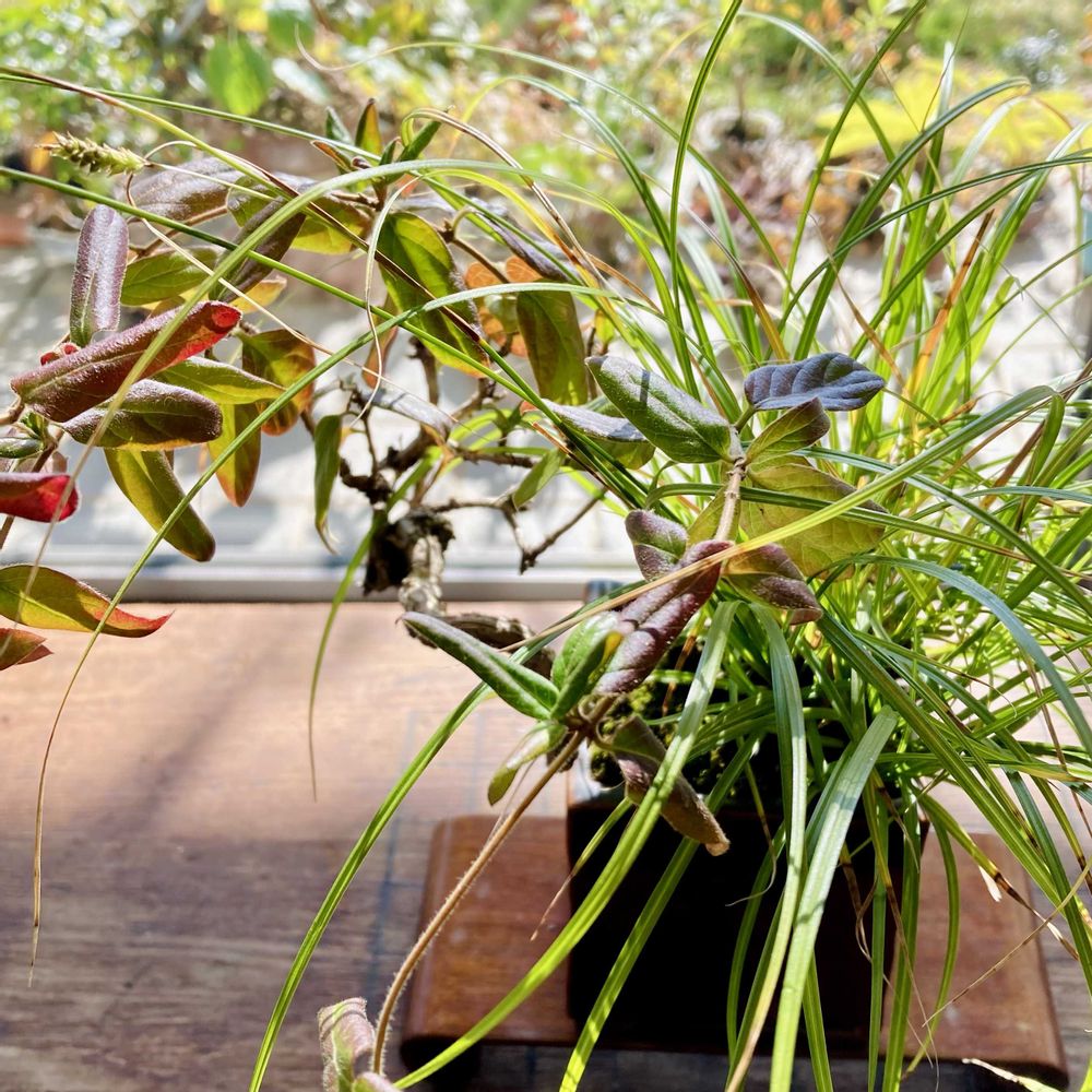 スイカズラとカンスゲの寄せ植えです。スイカズラは紅葉し、カンスゲは花穂を伸ばしてきました。