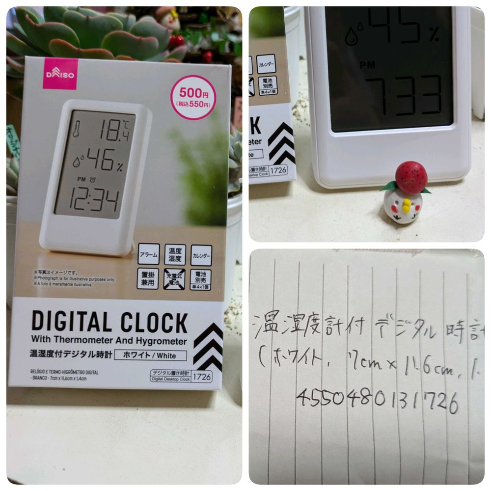 あっ③はダイソーの温度計ご紹介ーーはなさんのYouTubeでご紹介してるのだけど、最低気温、最高気温が後ろのボタンででてくれる〜うちのはもっと大きくて2000円したかなぁー!?550円はありがたい〜〜近くのダイソーにはもうなくて、取り寄せもできないって言われちゃって、探してみたいので番号教えてくださいって言ったらメモしてくれましたーー