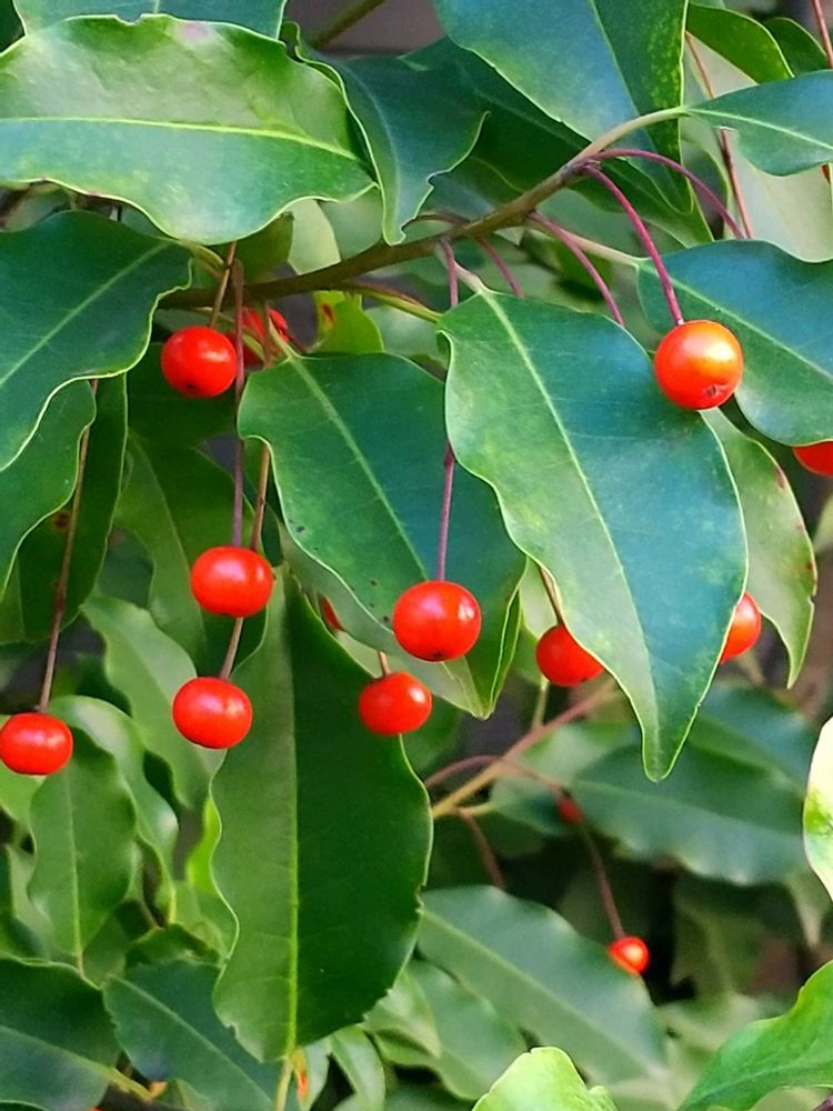 緑の葉に長い柄の🍒ソヨゴ(冬青)