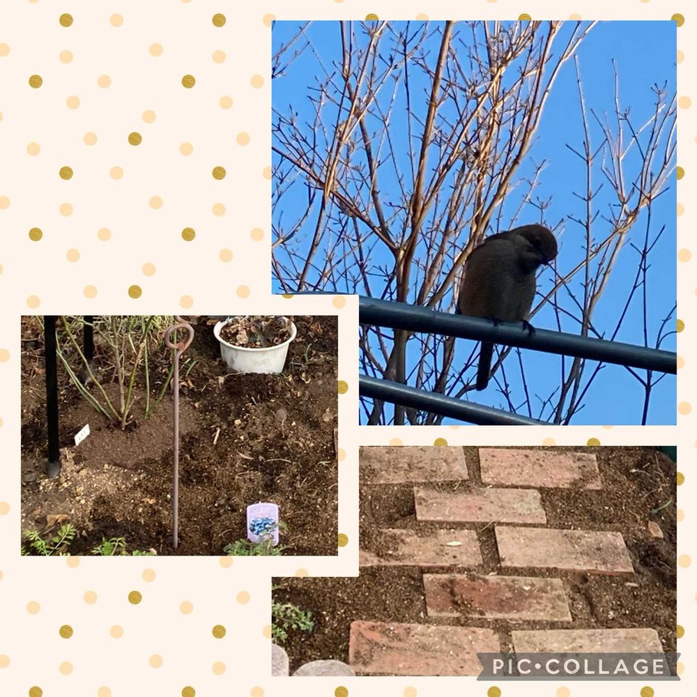 黒く塗ったら自転車小屋の骨組みがアーチらしくなり、早速現場監督のモズちゃんが来ました(^^)
