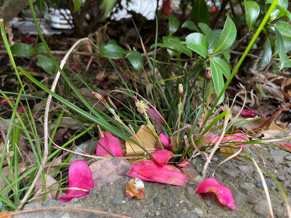 (サザンカの花弁ではなく)細い葉っぱです、花?穂?が出ています。自分で調べたところカンスゲじゃないかな、と思いますが合っていますか?