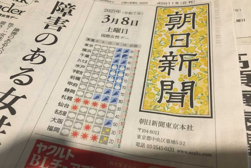 朝日新聞の題字がミモザであしらわれていました