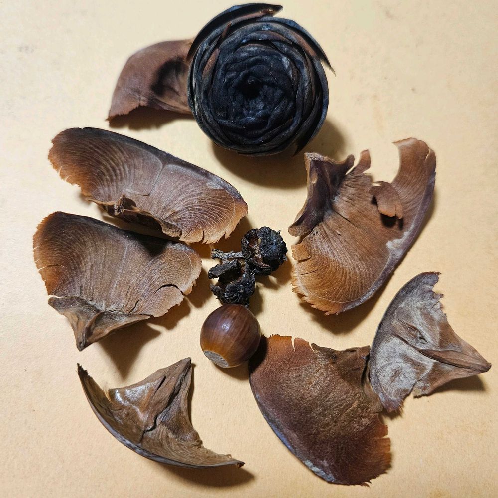 去年の今頃お友達から拾ったシダーローズごっそり頂いたけど(彼女は沢山落ちてる所を知っている😍)③の黒い子が開くと①になるのね💡💡💡③の真ん中の黒い小さい粒(ドングリの上のニコイチさん)は何かな❓️🤔❓️