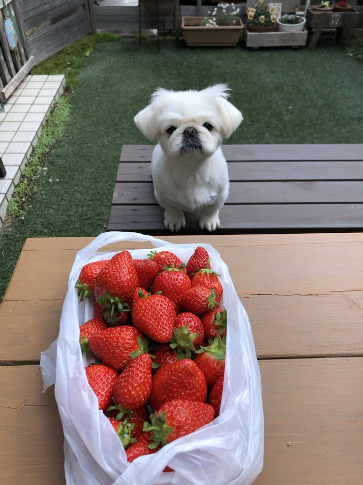 🍓見て喜んでジッとおすわり、でもこの後早くちょうだいと吠えました😆笑