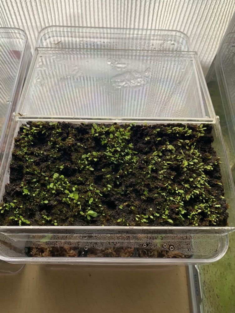 胞子培養に使うケースの順は、胞子を蒔くときは100均の透明蓋付きケース、スペーシングは果物などが入っていた容器、鉢上げ後はダイソーのシューズケース。