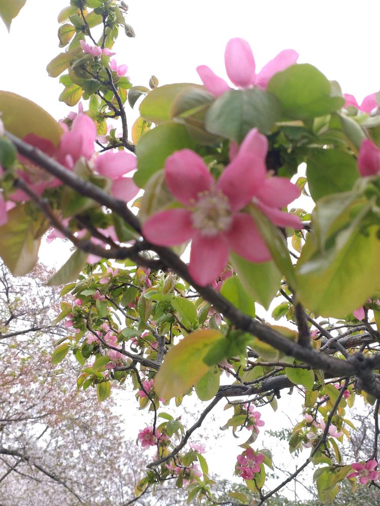 川沿いの遊歩道にかりんのピンク色のお花🩷 後ろの方に桜🌸とコラボで