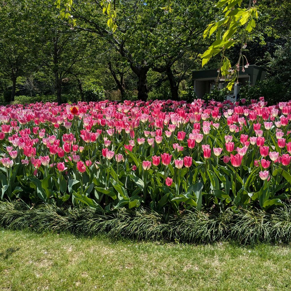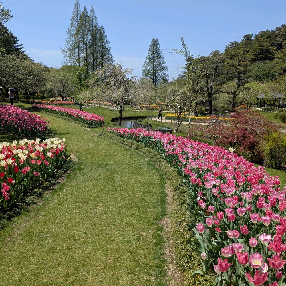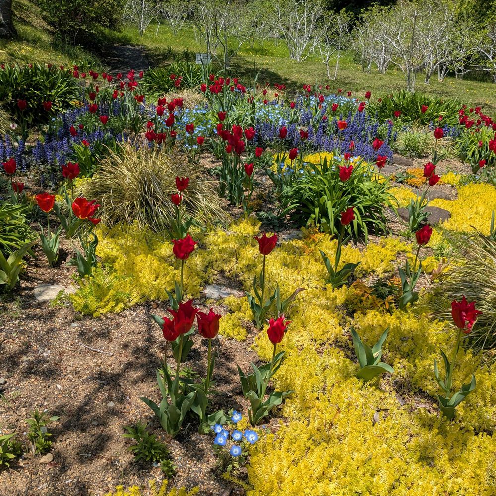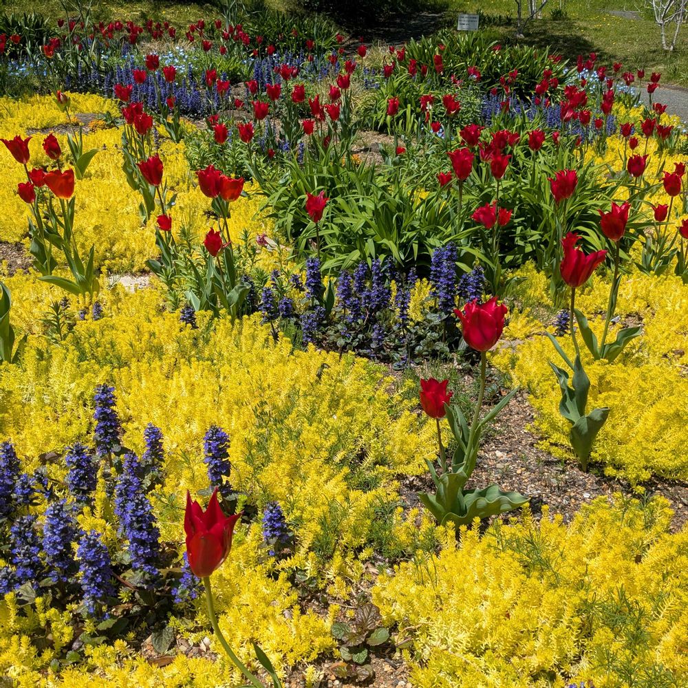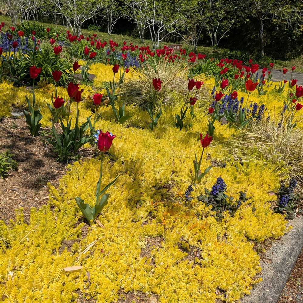 チューリップと、黄色い所は、ホソバオウゴンマンネングサです😄チューリップに、囲まれて、幸せな気分にひたりました😄