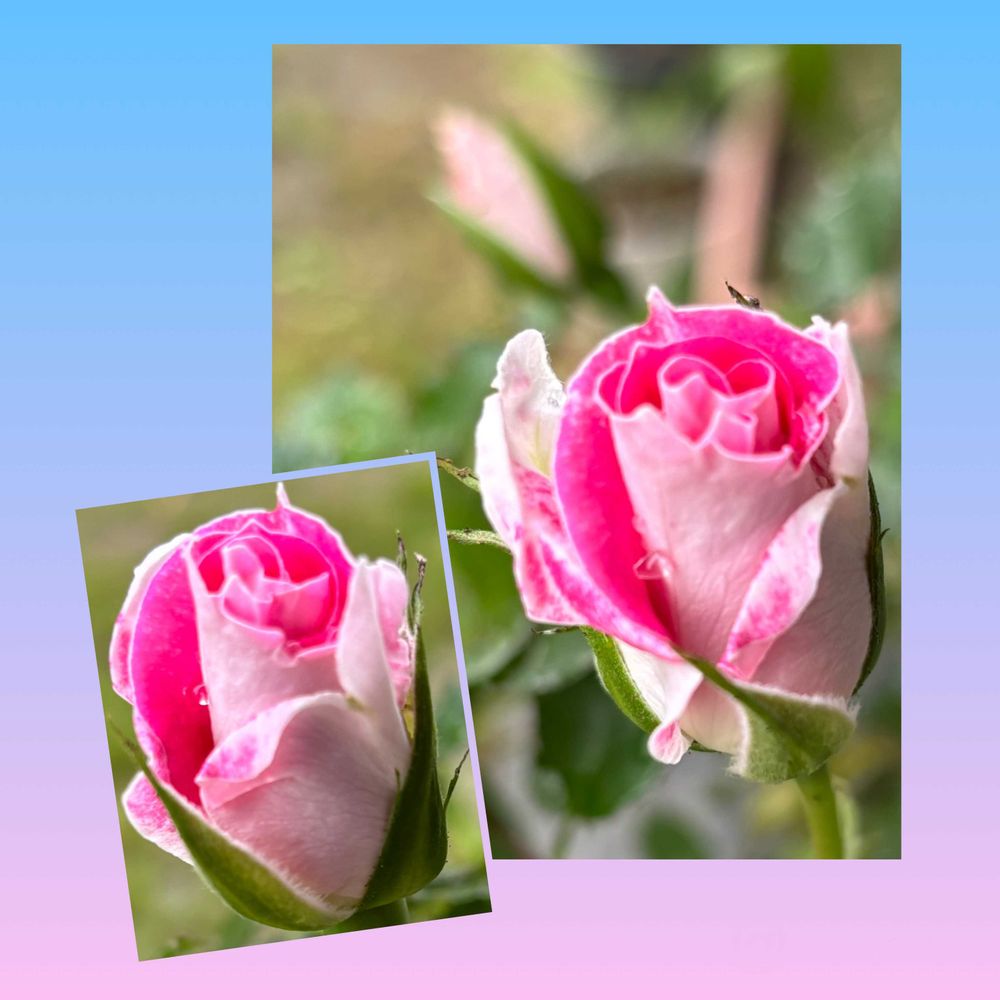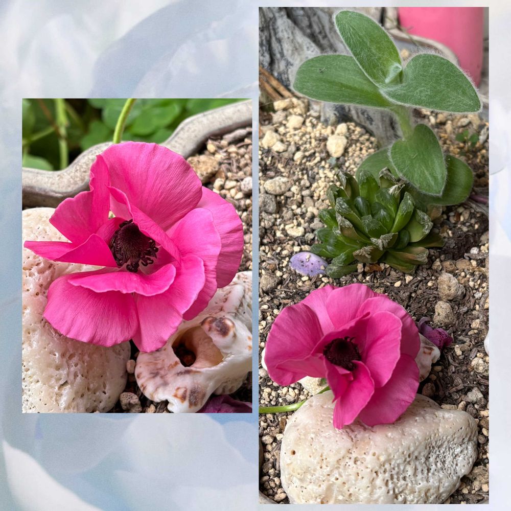 1️⃣人は裏表があるとよろしくないけど〜、、バラは裏表あってNICE👍😉💕🩷🤍🩷2️⃣ラナンキュラスさんもうお疲れです。多肉さんの鉢にバタン。ハオルチアさんがびっくり👀‼️