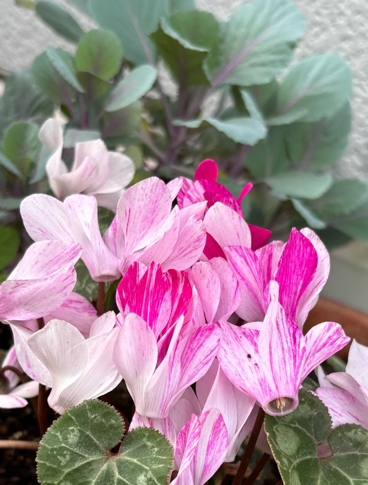 ガーデンシクラメンさんもまだまだ元気^_^。🩷ハボタンさんは花も終えて葉っぱは緑になりました🟢。