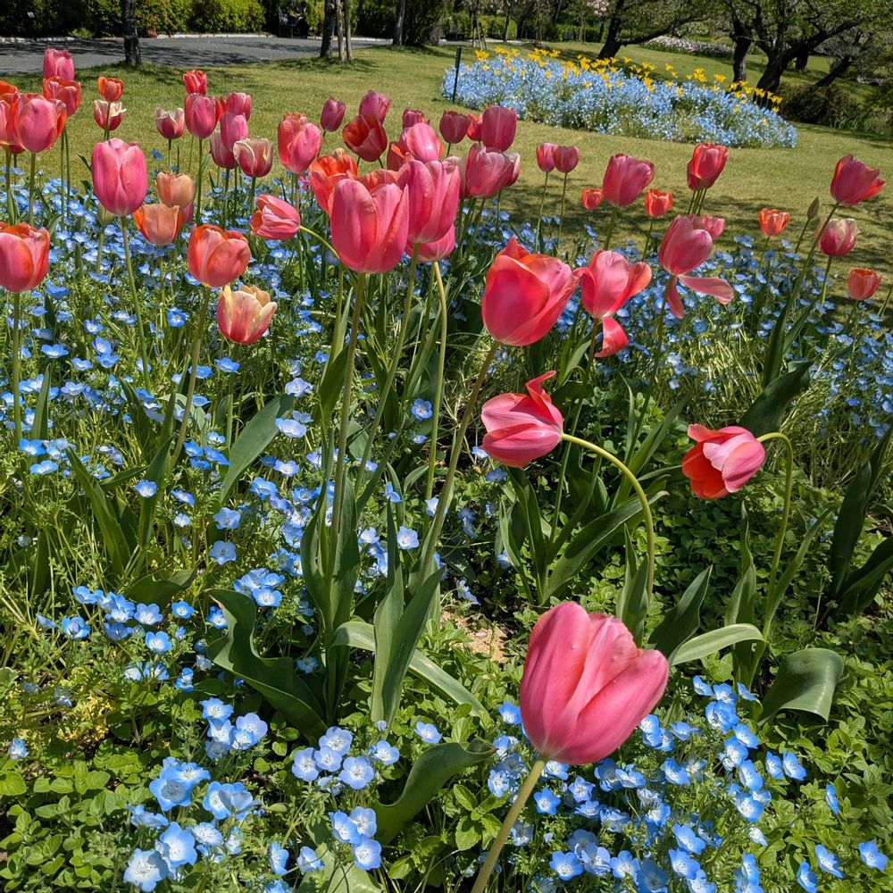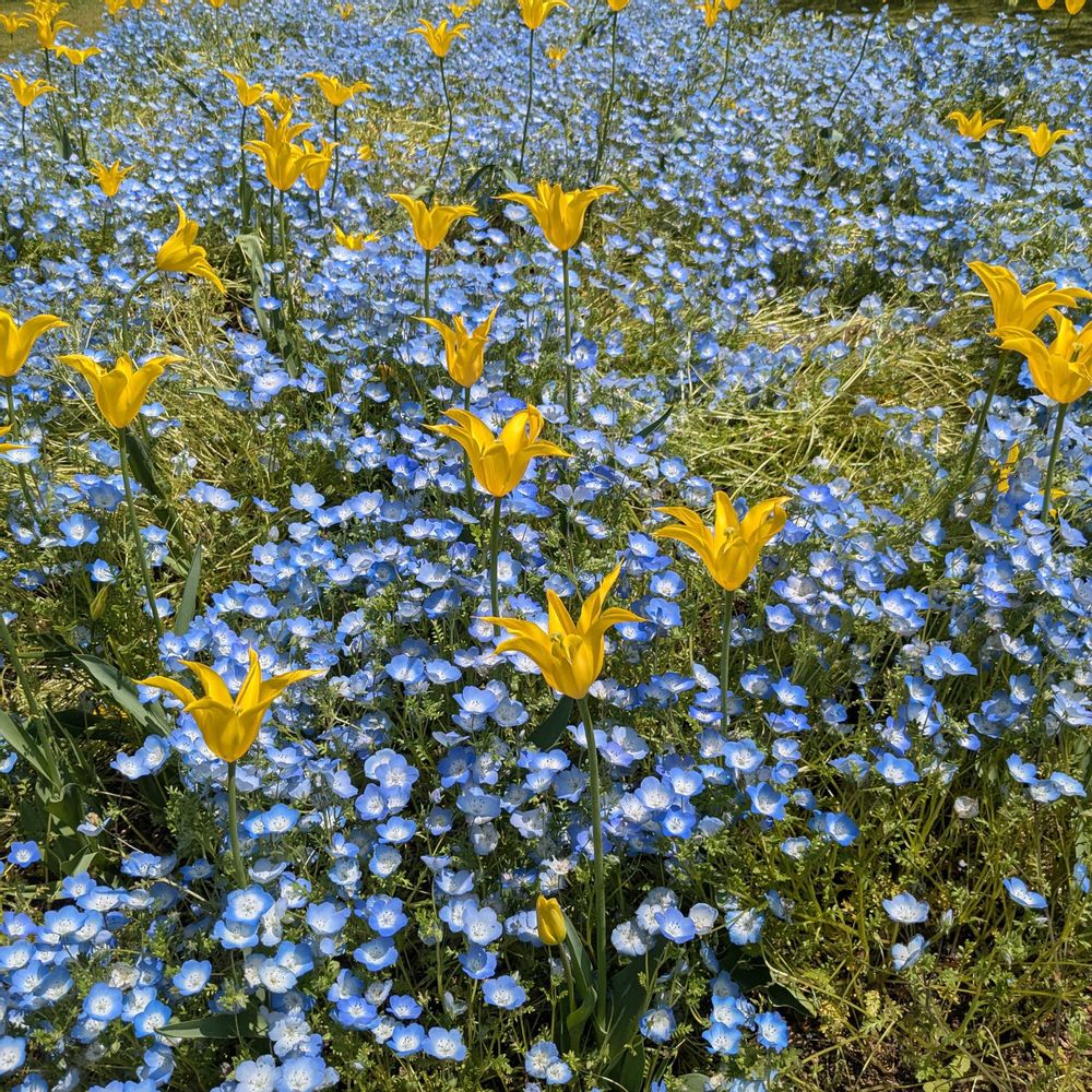 ネモフィラとチューリップです😄水に浮かぶ花、みたいで、綺麗でした😄最近と思っていたら、4/17撮でした😅