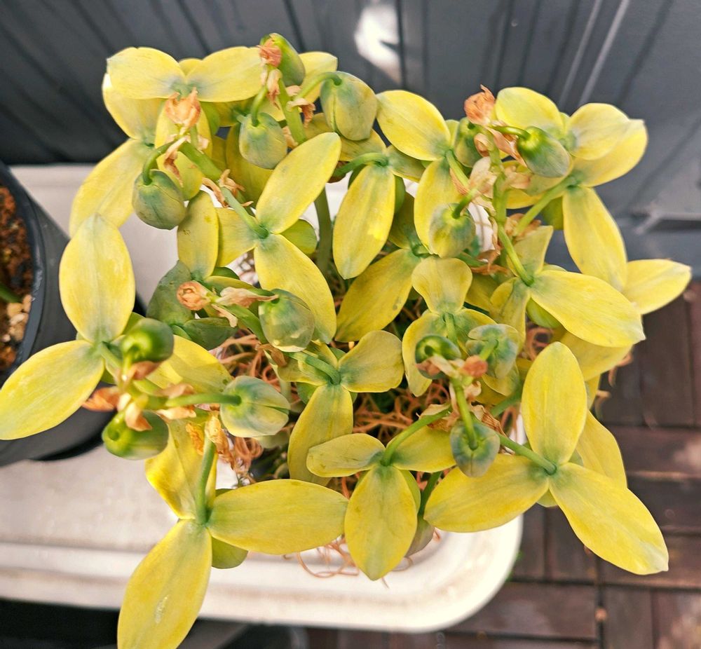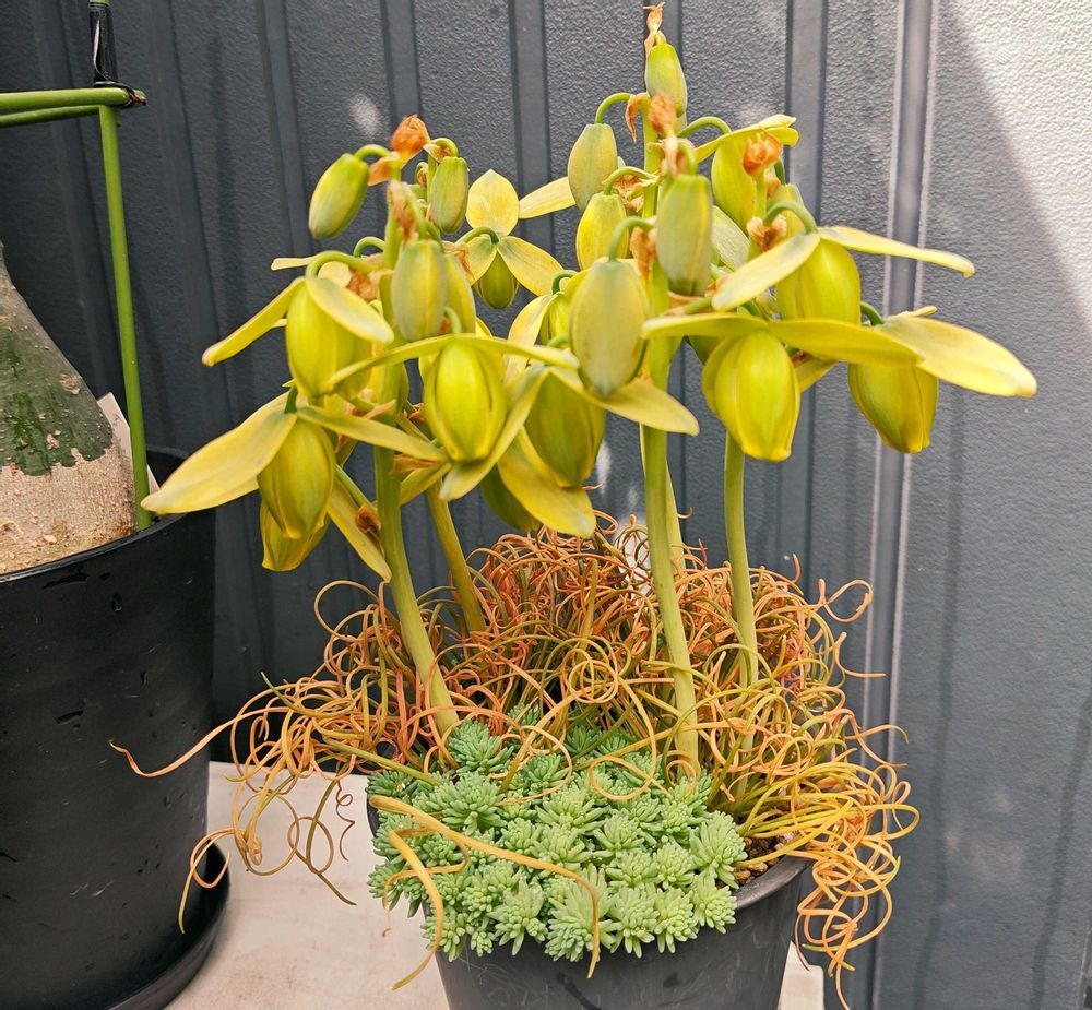 セダムがお邪魔してますが、クルクル葉っぱは花に力使ってるのか枯れぎみですね💦