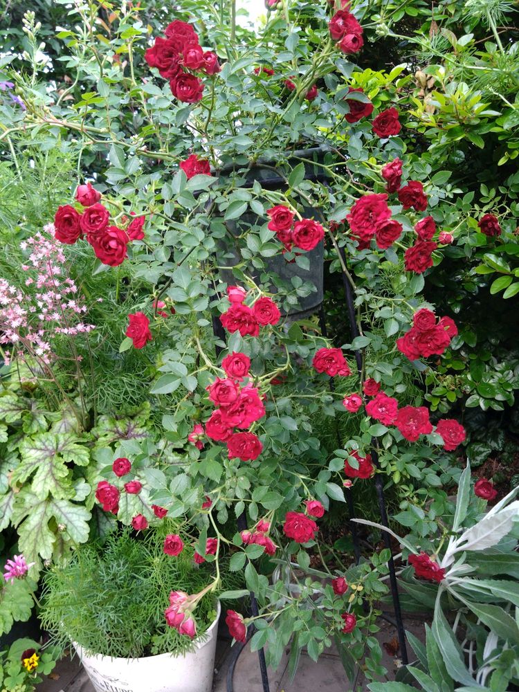 レッドキャスケード🌹可愛いですよね♥️ オベリスクかフェンスに誘引してもいいんだけれど、下がっても咲くから下げるようにしたいです☺️💕