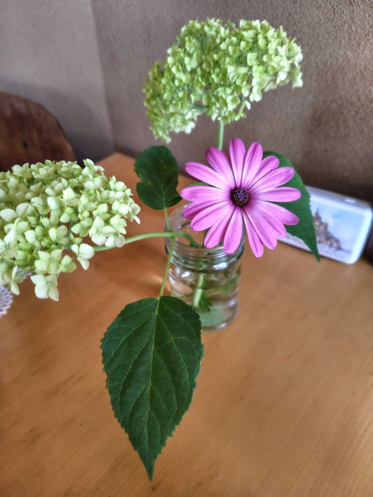 ②,⑤…帰り道、金魚とメダカの瓶を眺め、畑の野菜の生育の様子を観て、斜向かいの花友ご夫妻からアナベル💚💚と出来立てのキュウリ🥒✨を頂いて、嬉しい,ありがとう💕の気持ちの午前中です…😌🙏🩷🫧